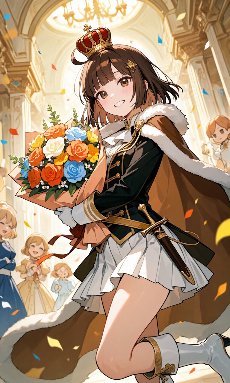 1girl, a young woman with brown hair styled in a hime cut with blunt bangs and a single ahoge. She has large, expressive brown eyes and a cute, happy face with a cheerful grin. She is dressed in a (Black luxurious Prince costume:1.5) with long sleeves, a (Brown luxurious Cape:1.3), a (luxurious White mini skirt:1.3), and (White luxurious boots:1.3). She wears (White gloves:1.2) and has a (dagger on waist:1.3). On her head rests a (luxurious crown on head:1.3). She is (holding a bouquet in hand:1.5) of colorful flowers. The scene is set in a grand, luxurious ballroom with Rococo architecture, featuring ornate columns, arches, and chandeliers. The atmosphere is light, dreamy, and romantic, with the setting being a birthday celebration. She is (surrounded by friends:1.8), who are also dressed in elegant attire, and the room is filled with lots of flowers. The style of the image is insanely detailed and beautiful, with a focus on the intricate textures of the clothing, the sparkle of the decorations, and the joyful expressions of the characters.