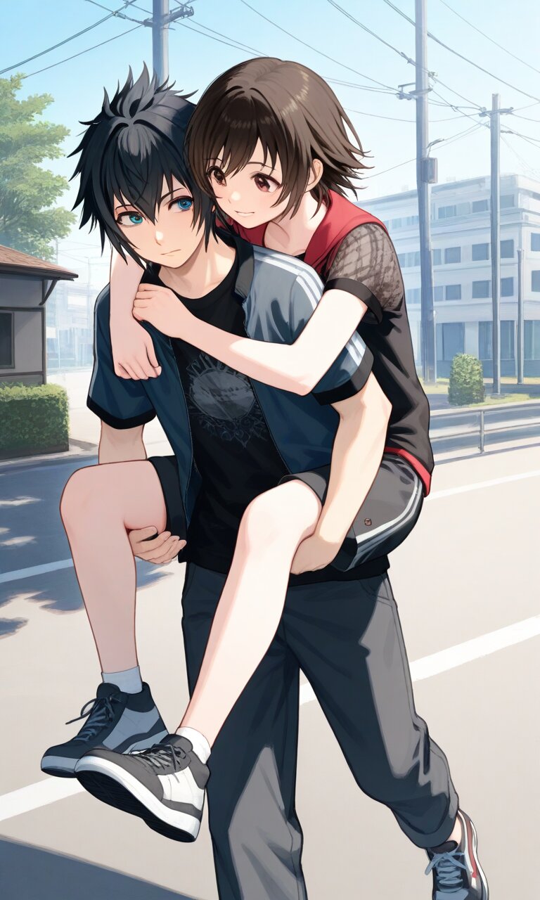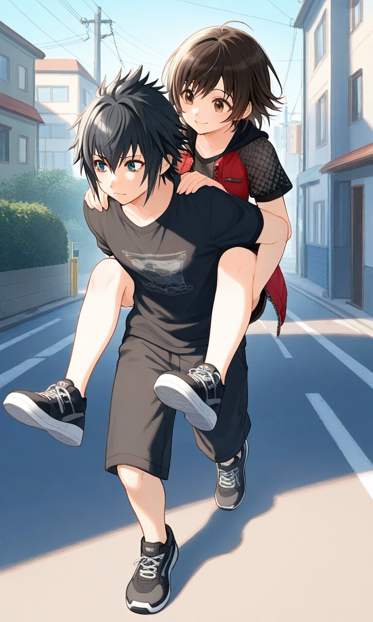 Boy, girl, couple, a young couple running down the street on an oiled surface holding eachother, 1girl, 1boy, piggyback, shirt, outdoors, shoes, carrying, walking, power lines, utility pole, shorts, building, pants, sneakers, shirt, smile, street, jacket, short sleeves BREAK the boy(FFNoctis, 1boy, black hair, blue eyes ) BREAK the girl(Iris Amicitia, female,brown eyes, ),
