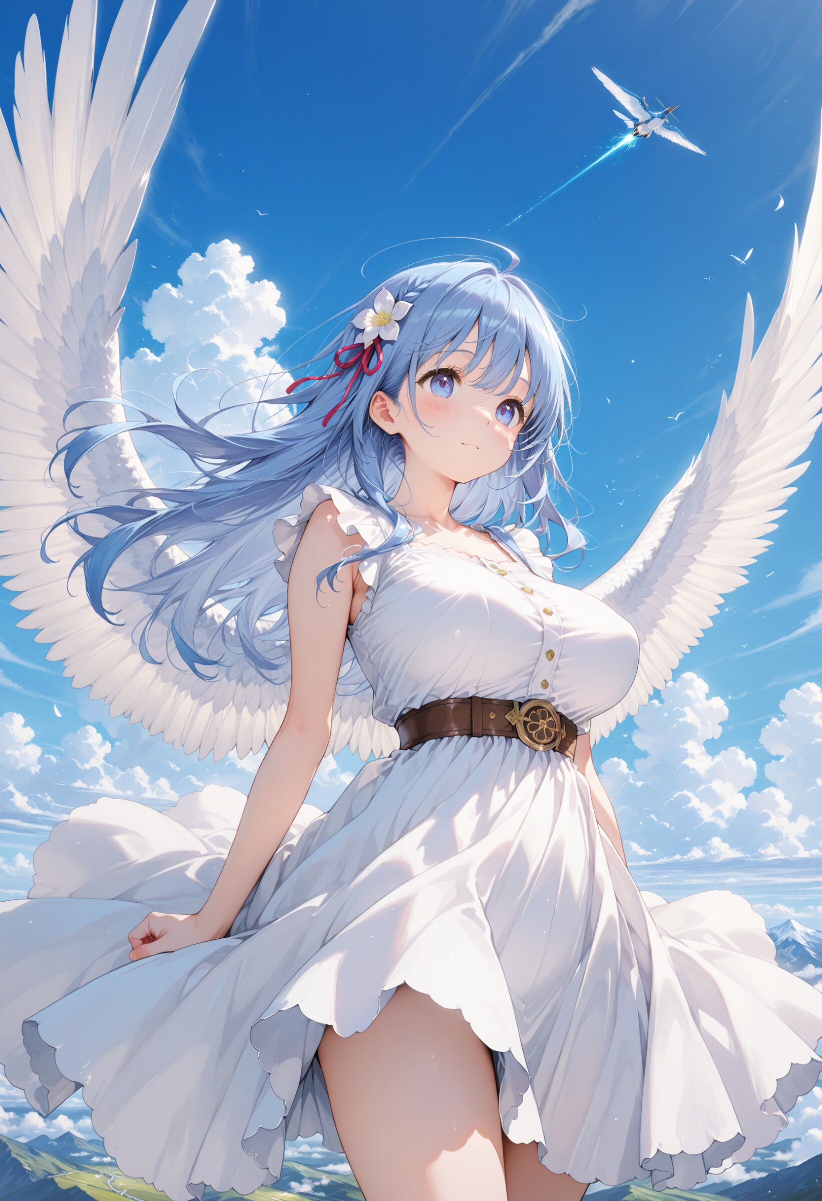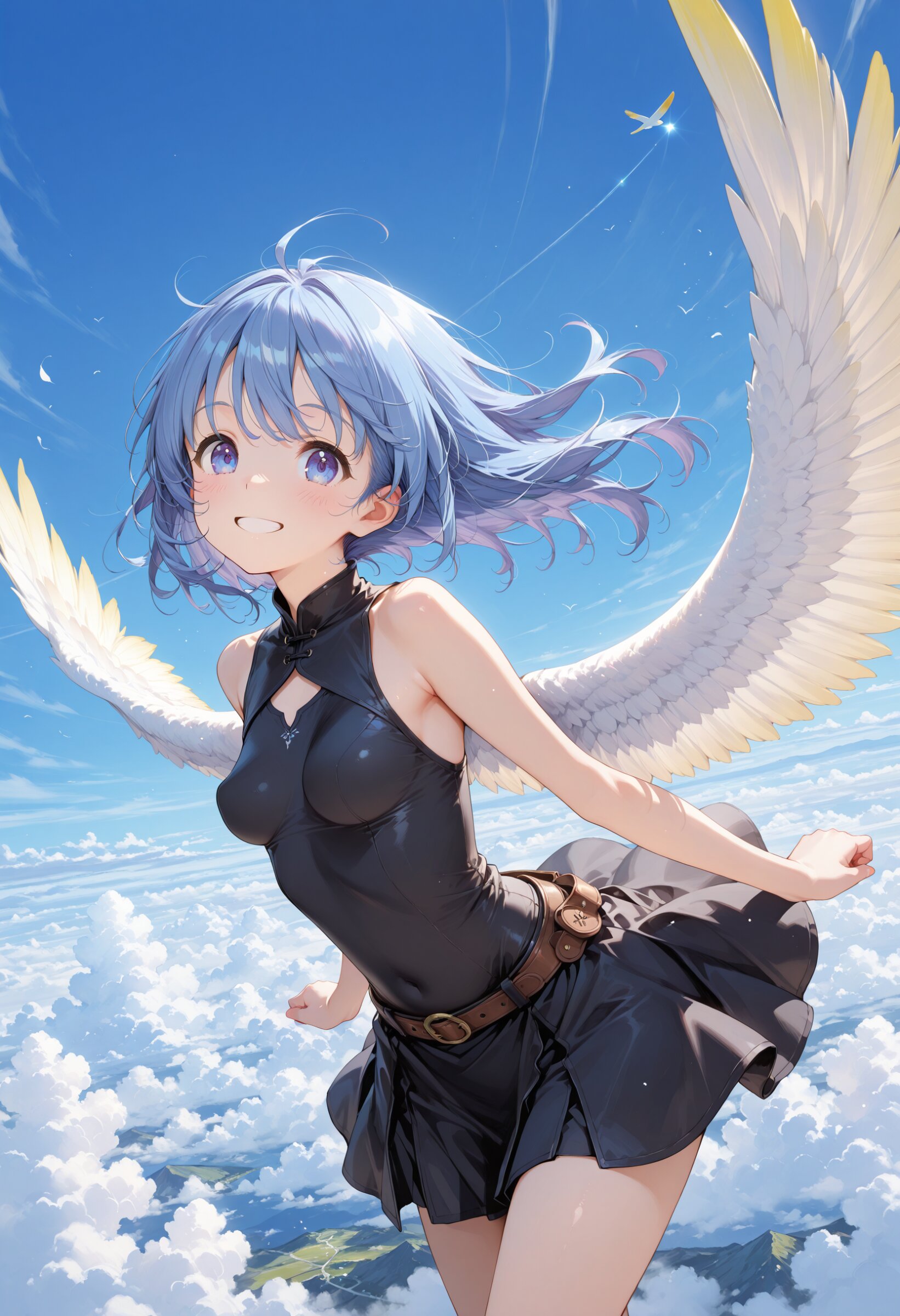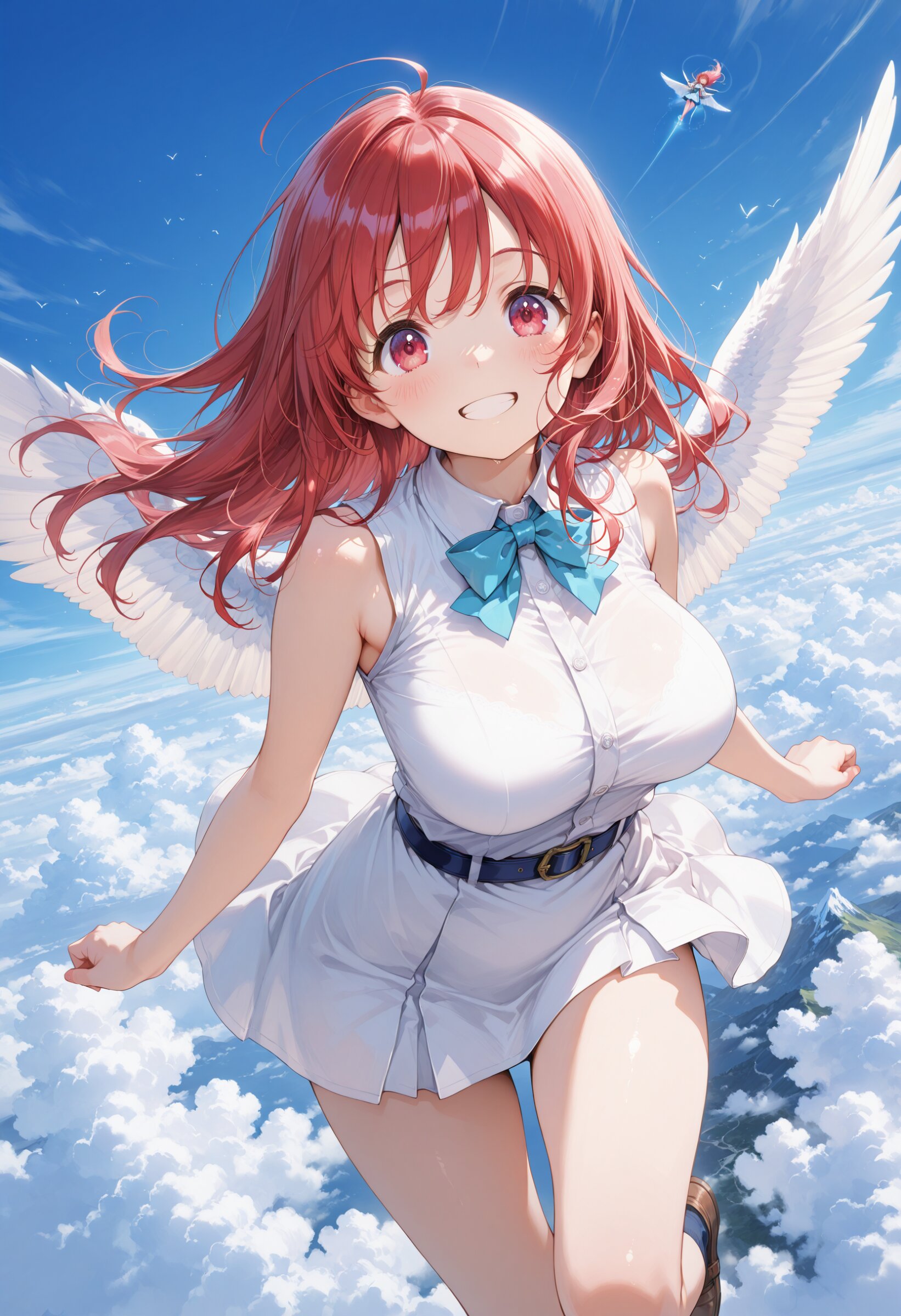 masterpiece, best quality, amazing quality, general, fine detail, official art, 1girl, loli, big breasts, perky breasts, kawaii, cheerful smile, riding on the back of a large cute dragon with massive wings, soaring high above the clouds, bright blue sky, dynamic flying pose, wind blowing through his hair, vivid and adventurous atmosphere, fantasy illustration, cowboy shot,