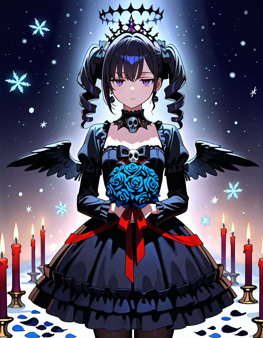 anime illustration, 2d art, stylized illustration, 1girl, gothic angel, black twin drill hair, purple eyes, jitome, expressionless, small breasts, (short gothic frilly dress, black wings folded behind:1.1), skull motif accessories, skull necklace, skull earrings, (tiara:1.1), black halo, holding bouquet, holding black rose bouquet, bouquet of black roses, black rose bouquet with red ribbon, small silver bell on bouquet, christmas ribbon, hands gently holding flowers, christmas, dark christmas, gothic christmas, christmas night, holy night, red and black color scheme, soft christmas lights, subtle festive glow, black roses floating in background, black rose petals floating, petals swirling gently, snow, falling snow, snowflakes mixed with petals, black christmas wreath, gothic wreath, black roses wreath, candles, black candles, candlelight glow, dim candle light in background, facing forward, standing still, calm pose, (dark aura:1), (black smoky haze floating subtly around her:1.3), shadow mist, dark particles, fallen angel, sacred yet ominous, quiet, cold atmosphere, soft dark lighting, dim glow, winter night, silent night,cowboy shot,, (best quality,masterpiece:1.4),(high resolution,super fine illustration:1.36),shiny skin,finely,detailed face,japaneese idol