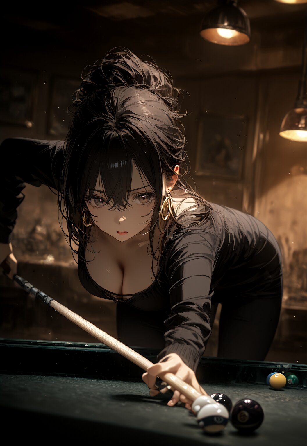 CG, anime, source anime, illustration, blurry, industrial pipe, cable, realistic, robot, indoors, ground vehicle, motor vehicle, vehicle focus, english text, ceiling light, light, mecha, depth of field, ceiling, solo, still life hand on own ear, long sleeves, hair up, hair bun, 15 sheet hair tucking, hair between eyes, jewelry, adjusting hair billiards, cue stick, billiard ball, pool table, from behind, feet out of frame, looking up, despair, open mouth, Perfect hand, Detailed hand, eyeshd kk sexybody 01 dark, billiards, table, ball, holding, leaning forward, closed mouth, bent over, cleavage, ass, hoop earrings. 1girl, earrings, hoop earrings, masterpiece, best quality, newest, absurdres <lora:billiards_Illust_v1:0.8> <lora:Better hands - SDXL v2.0:0.8> <lora:Eyes_High_Definition-000007:0.77> <lora:kk_sexybody_01:0.65> <lora:dark:0.66> <lora:billiards_Illust_v1:0.77> <lora:Hoop_earrings:0.66>