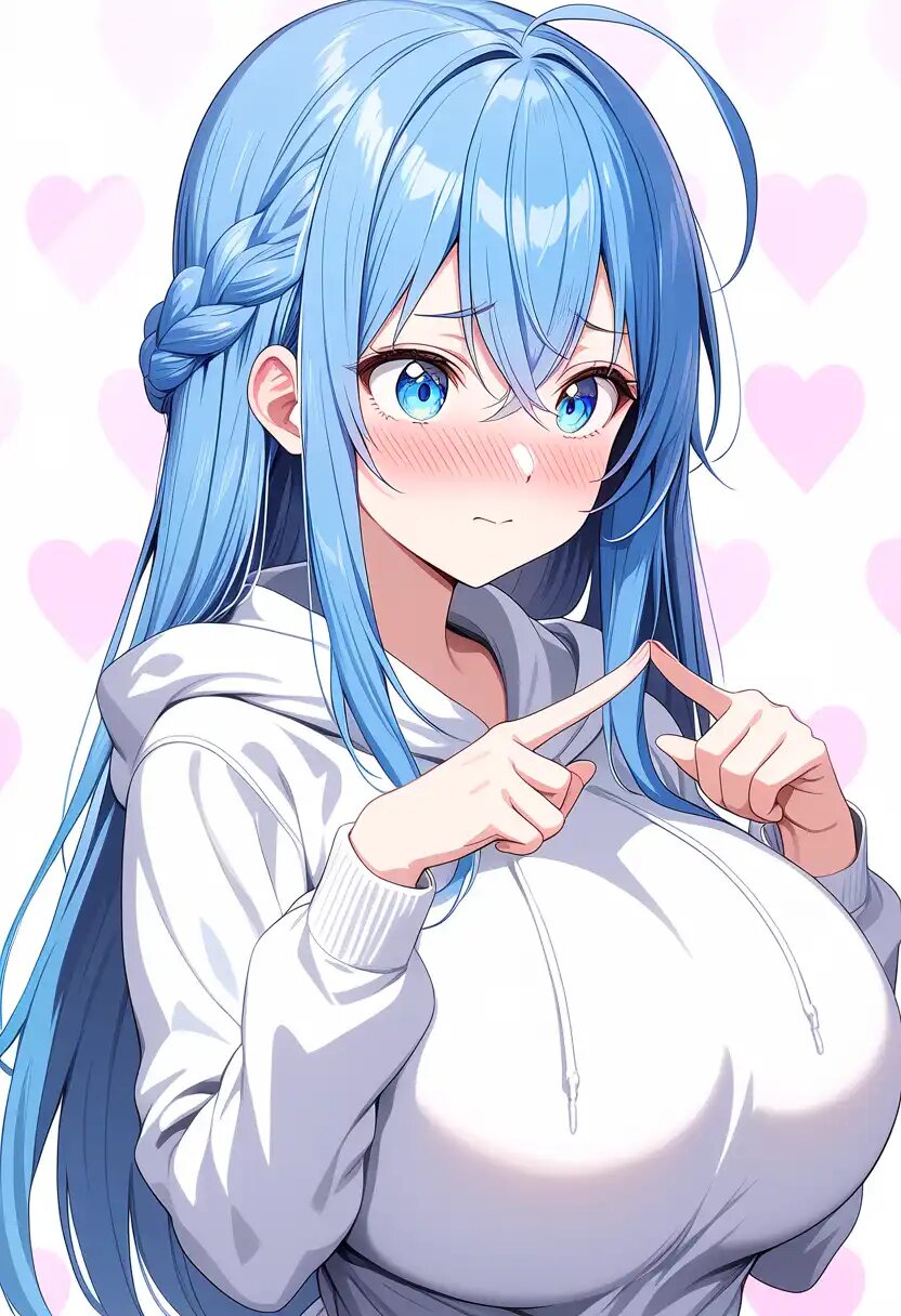 masterpiece, best quality, ultra detailed, 8K, [index fingers together]++, [upper body]++, [looking at another]++, [nose blush]++, [worried brow]++, [heart background]+, [huge breasts]++, perky breasts, hanging breasts, curvy, [hoodie]++, standing, tall, [long hair]++, [straight hair]++, [shiny]+, [shiny skin]+, [shiny clothes]+, closed mouth,