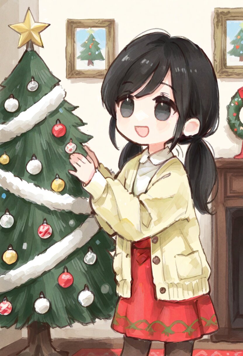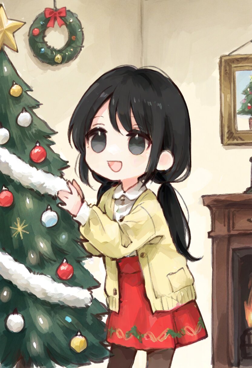 <lora:inmnstyleilxl:0.9>, ultra-detailed, best quality, masterpiece, very aesthetic, watercolor painting, general, 1girl, chibi, solo, antique room, decorating the Christmas tree, black hair, low pigtails, black eyes, yellow knit cardigan, white sweater, crimson flare skirt, brown tights, smile, open mouth