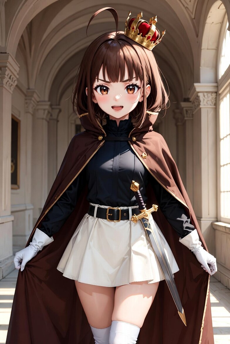 A young woman with brown hair styled in a hime cut with blunt bangs and a single ahoge. She has large, expressive brown eyes and a cute, happy face with a cheerful grin. The shape of her pupils and her gaze are aggressive. She is dressed in a black luxurious Prince costume with long sleeves, a brown luxurious cape, a luxurious white mini skirt, and white luxurious boots. She wears white gloves and has a dagger on her waist. On her head rests a luxurious crown. She is in a scene celebrating her birthday in a palace.