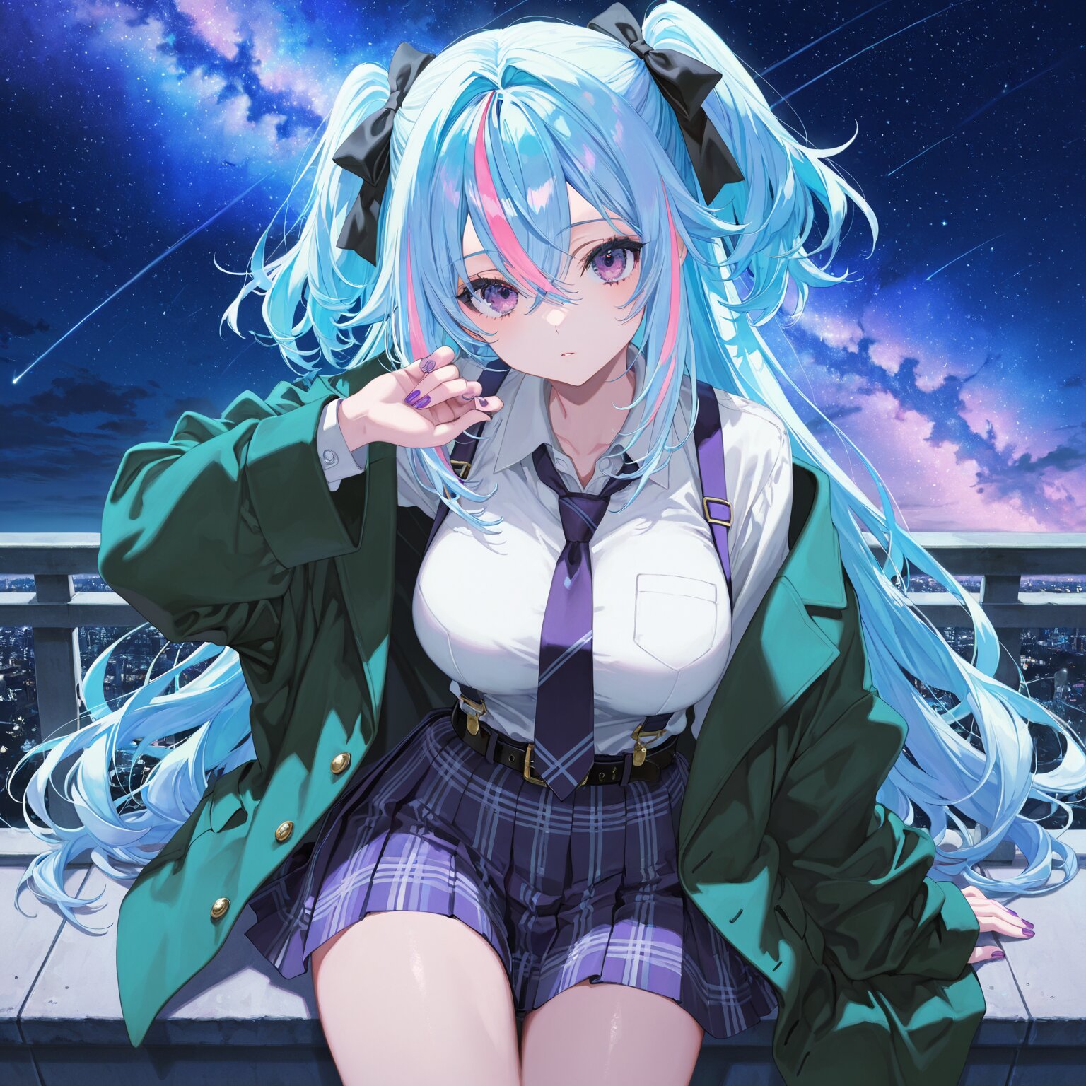 (1girl) (blue hair:1.3), long hair, two-sided updo, (pink streaked hair:1.3), black ribbon purple eyes, purple nails large breasts, belt, oversized jacket, suspenders School uniform, green blazer, dress shirt, tie Pleated skirts, mini skirts, BREAK, ((newest, anime, animation, anime screen capture, anime style:1.3)) BREAK, ((masterpiece, , vibrant, very aesthetic, highly detailed, best quality, 16k:1.3)) (perfect fingers:1.2)