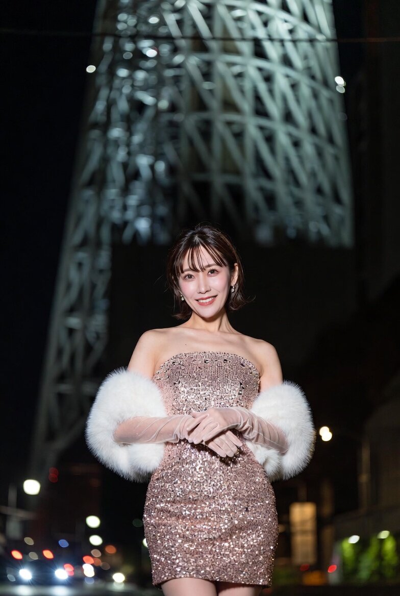 A photo taken by another person at human eye level, featuring a subject in a relaxed, confident stance with a slightly angled body and soft confident smile, hands naturally positioned and elegant. The subject is a Japanese woman in her 30s, wearing a strapless mini evening dress in blush pink, fully glittered and crystal-embellished, with dense sparkle under flash, light fabric shimmer, long matching blush pink evening gloves, and a short white faux fur stole around the forearms. Makeup includes natural human skin texture, soft pink blush, natural rose lips, and defined but realistic eyes, preserving exact face, facial proportions, skin tone, skin texture, eye shape, nose, and lips, with no face swap, no beautify, no smoothing, no reshaping, no stylization, no AI face look, and flash-neutral skin tones with no warm spill. The scene is set at the base of the Tokyo Sky Tree, with the camera at close, personal friend-like distance, straight-on angle, subject centered, and the Tokyo Sky Tree visible but not exaggerated. The sky is deep dark navy night, and the background shows the Tokyo Sky Tree iron structure as a dark metallic landmark with warm brownish-amber reflections in bronze, dark caramel, warm brown metal reflections, not bright lights or yellow, with a color temperature of 1800K–2100K, allowing only warm brown, burnt amber, and bronze tones, forbidding yellow, bright gold, lemon, white gold, and greenish yellow. The street level is softly blurred with subtle bokeh from headlights and lamps, round, soft, low-intensity orbs, not bright, and depth of field keeps the subject sharp while the background is softly blurred. Lighting includes direct medium-strength smartphone flash on the subject only, with the tower softly illuminated through metal reflections, not as a light source. The photo style is a real unedited tourist night photo.
