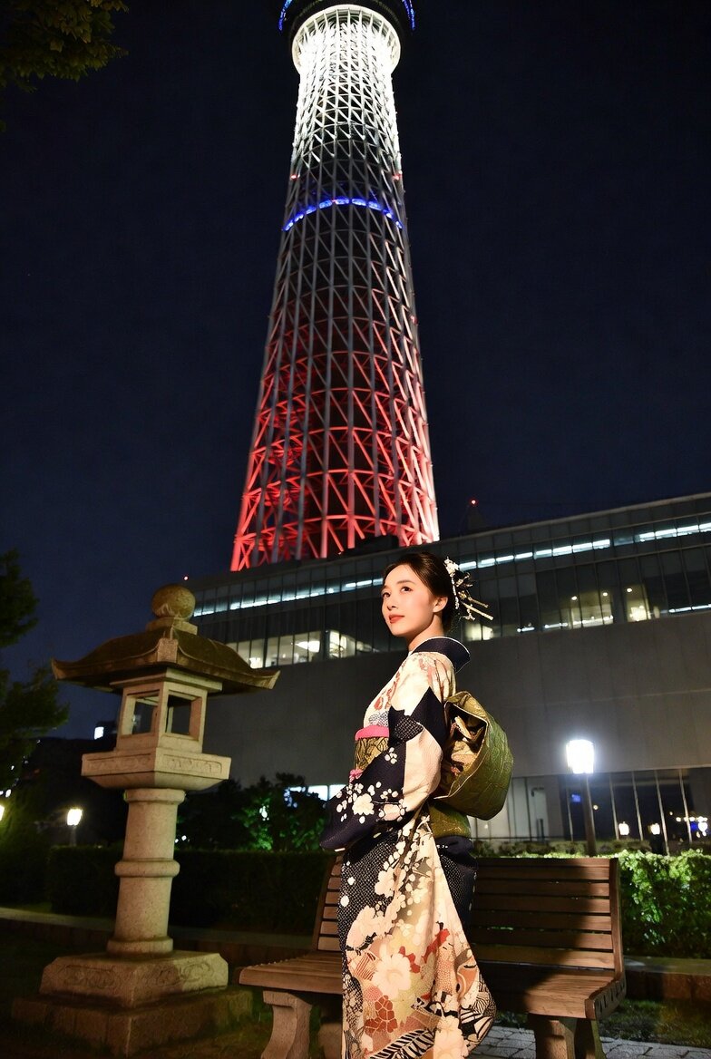 A Japanese woman in traditional attire stands before Tokyo Sky Tree at night, in a serene, elegant setting.