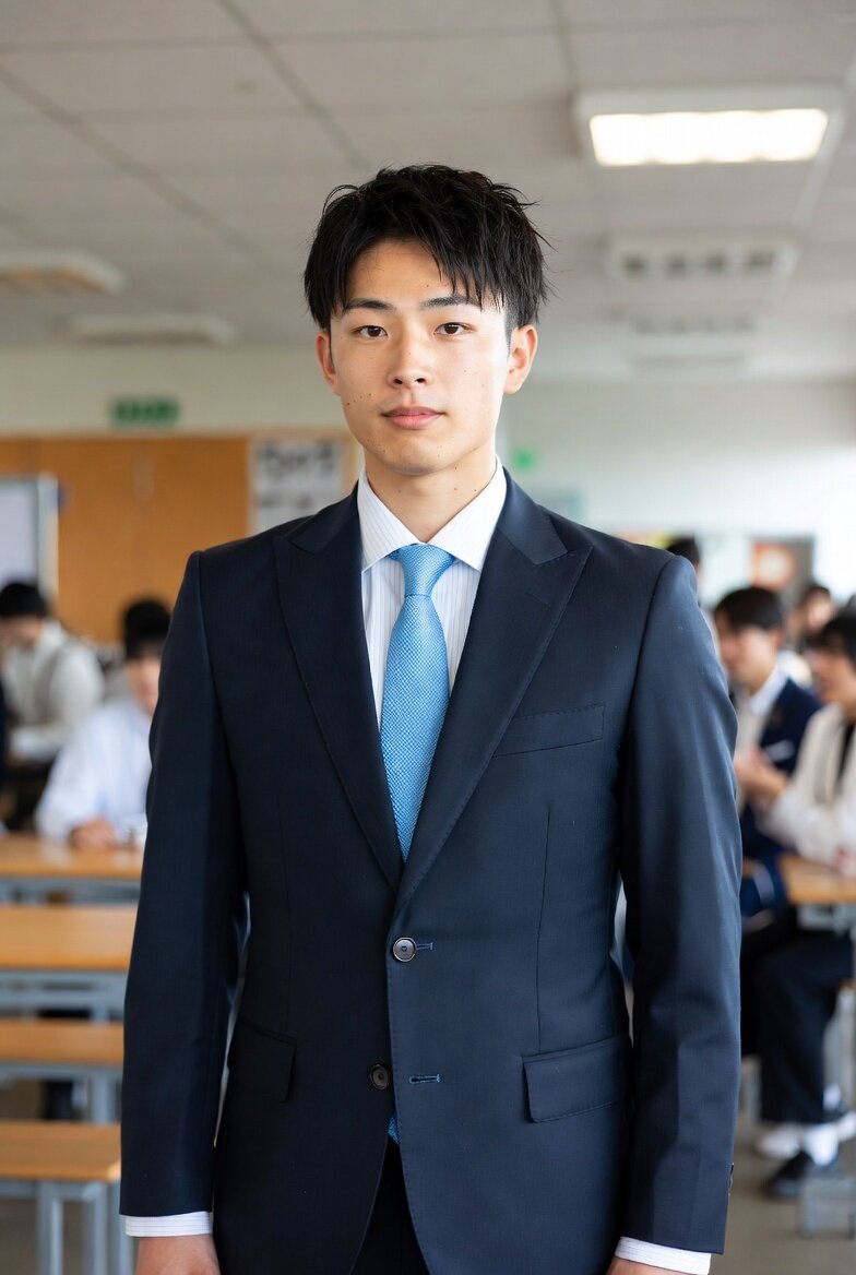A 20-year-old Japanese man in a clean, new business suit. The shirt is white, and the tie is sky blue. He has a slightly nervous demeanor. The background is a school cafeteria, with other people dressed in student-like clothing.