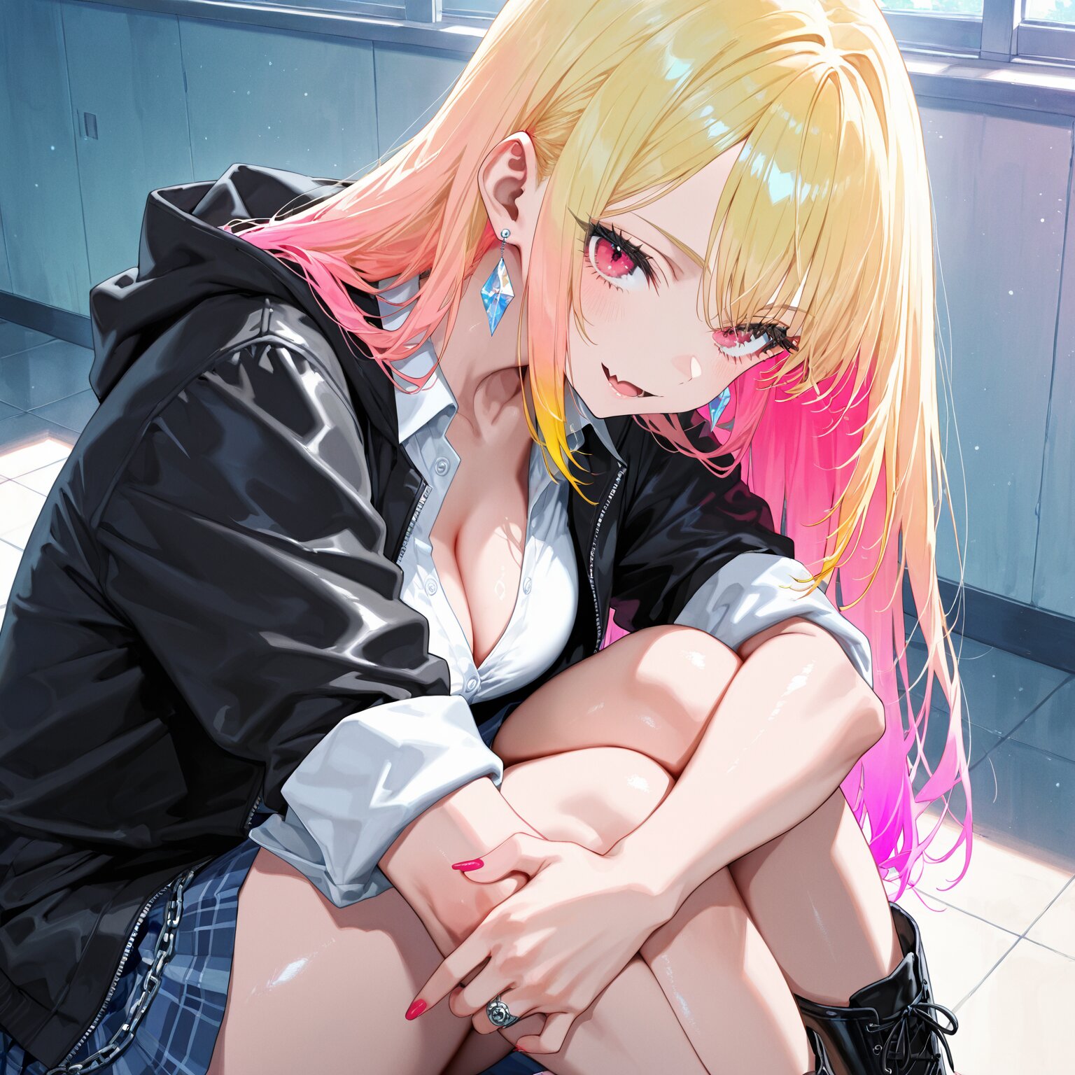 (1girl), young female, BREAK, (((blond long hair, Straight Hair:1.7))), ((sharp bangs:1.5 )),((Long sideburns)),(((red eyes))), (slanted eyes), slender, (sweat:0.8), shiny body, shiny skin, (full breasts:1.3), Tight, tight waist, toned body, (muscular abs, abs:0.8), muscular BREAK, ((diamond-shaped earrings)), chain belts, chains, chain accessories, ring, (((pink inner hair, gradient hair from blond to pink:2))), ((skin fangs)), BREAK, Slender, narrow waist, toned body, athletic body, shiny skin, Highlights, beautiful eyes, beautiful pupils, Long nails, red nail polish, gorgeous nail polish, BREAK, ((School uniform:1.2)), white shirt, dress shirt, rolled up sleeves, cleavage, miniskirt, BREAK, black hoodie jacket, open jacket, leather boots arms crossed BREAK, ((newest, anime, animation, anime screen capture, anime style:1.3)) BREAK, ((masterpiece, , vibrant, very aesthetic, highly detailed, best quality, 16k:1.3)) (perfect fingers:1.2)