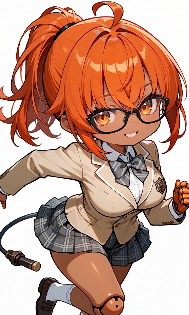 soft anime face,teenage,solo,delicate face,detailed face,detailed skin,masterpiece,best quality,insanely detailed,beautiful,16k,happy,school uniform,beige blazer,※お好きな色※ bowtie,plaid ※お好きな色※ mini-skirt,knee socks,loafers,floating hair,floating skirt,running,chibi,deformed,cute,kawaii,Happy Scene,simple white background 【校則】 bowtieはnecktieに変更可 skirtはpants(pants仕様の場合はknee socksを削除)またはshort pantsに変更可、floating skirtを削除