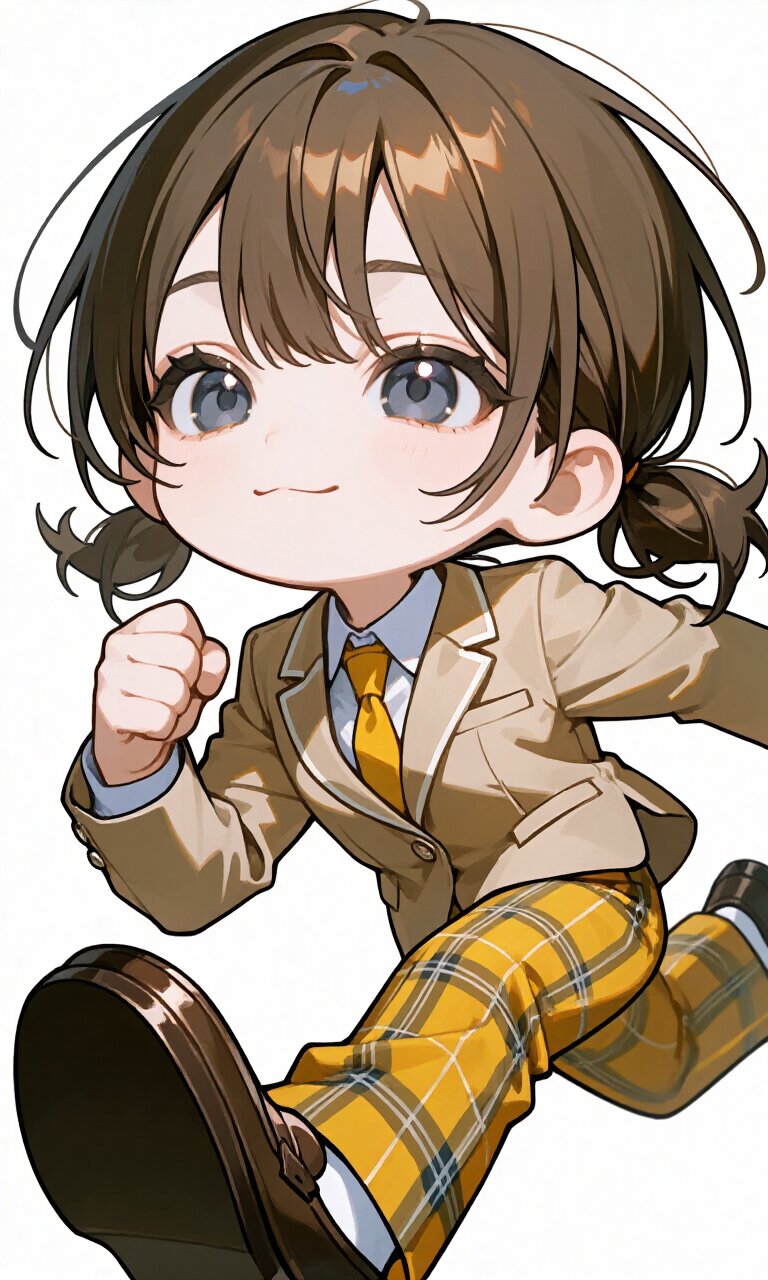 soft anime face,teenage,solo,delicate face,detailed face,detailed skin,masterpiece,best quality,insanely detailed,beautiful,16k,happy,school uniform,beige blazer,※お好きな色※ bowtie,plaid ※お好きな色※ mini-skirt,knee socks,loafers,floating hair,floating skirt,running,chibi,deformed,cute,kawaii,Happy Scene,simple white background 【校則】 bowtieはnecktieに変更可 skirtはpants(pants仕様の場合はknee socksを削除)またはshort pantsに変更可、floating skirtを削除