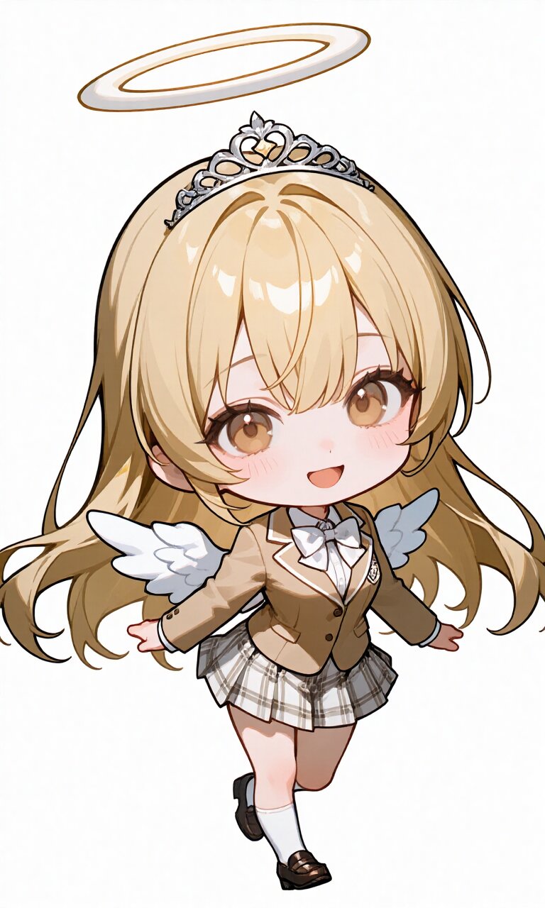 soft anime face,teenage,solo,delicate face,detailed face,detailed skin,masterpiece,best quality,insanely detailed,beautiful,16k,happy,school uniform,beige blazer,※お好きな色※ bowtie,plaid ※お好きな色※ mini-skirt,knee socks,loafers,floating hair,floating skirt,running,chibi,deformed,cute,kawaii,Happy Scene,simple white background 【校則】 bowtieはnecktieに変更可 skirtはpants(pants仕様の場合はknee socksを削除)またはshort pantsに変更可、floating skirtを削除