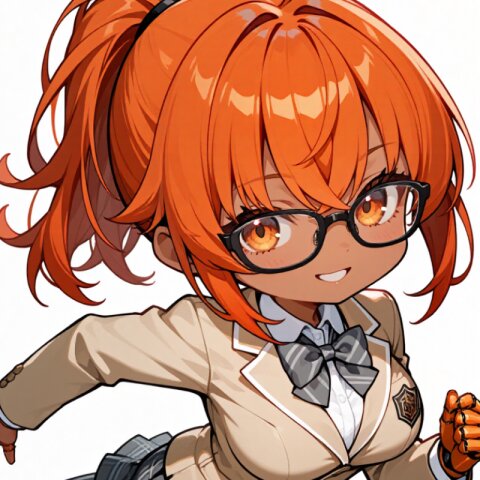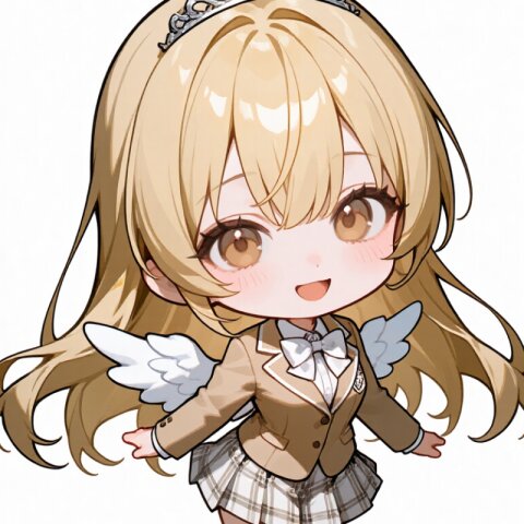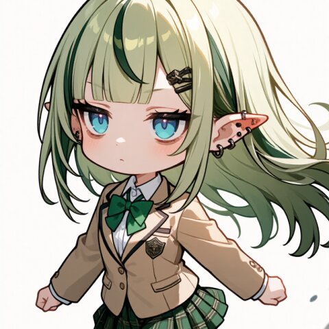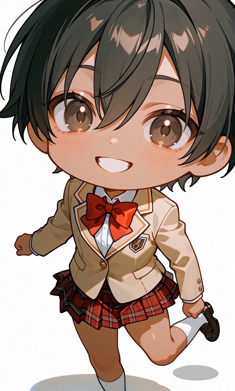 soft anime face,teenage,solo,delicate face,detailed face,detailed skin,masterpiece,best quality,insanely detailed,beautiful,16k,happy,school uniform,beige blazer,※お好きな色※ bowtie,plaid ※お好きな色※ mini-skirt,knee socks,loafers,floating hair,floating skirt,running,chibi,deformed,cute,kawaii,Happy Scene,simple white background 【校則】 bowtieはnecktieに変更可 skirtはpants(pants仕様の場合はknee socksを削除)またはshort pantsに変更可、floating skirtを削除