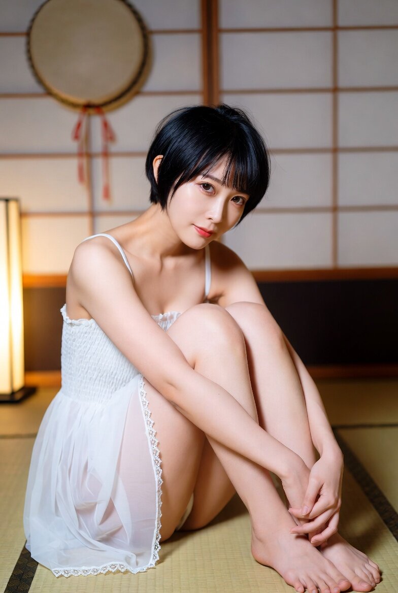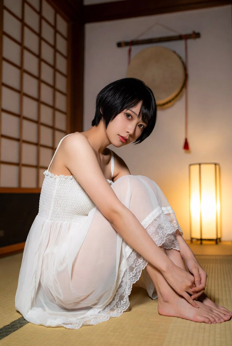 日本人女性24歳、短い黒髪のピクシー カット、前髪あり、色白の肌、繊細な顔立ち、伝統的な和室の畳の上に座っている、白いノースリーブの薄手ワンピース(スモックトップとレース裾のベビードール風)を着て、素足で膝を抱えるポーズ、穏やかで物思いにふける表情、暖かい間接照明とフロアランプの光、背景に障子と太鼓の飾り、居心地の良い落ち着いた雰囲気、高詳細、リアルな写真風、ソフトフォーカス、自然な肌質