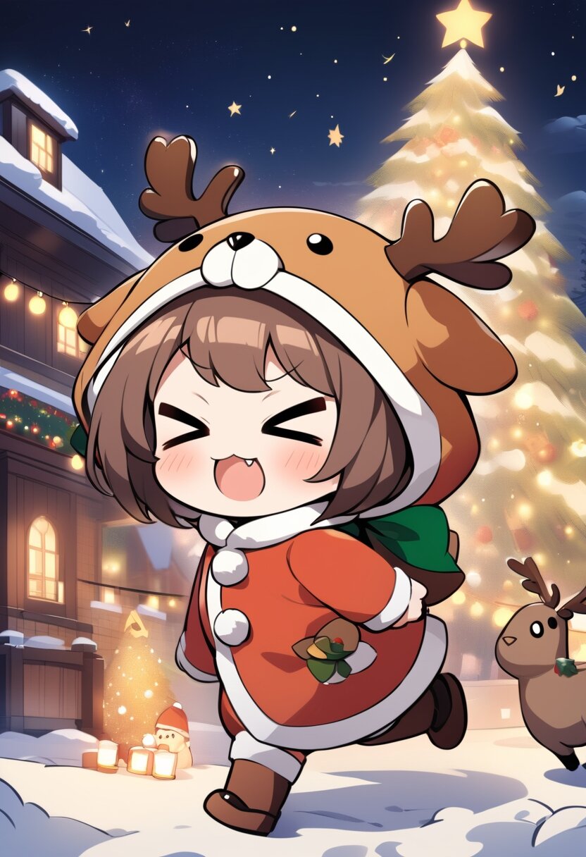Highly detailed, vibrantly colored, anime-style, masterpiece, 1girl, solo, chibi style, sidelocks, short hair, brown hair, closed eyes, :d, cosplay, bird, ((>_<)), blush, animal costume, reindeer, reindeer ears, reindeer hood, reindeer tale, hood up, :t, open mouth, :3, fang, walking, from side, outdoors, sky, cloud, blurry, tree, +++, at night, town, snowy, xmas decoration, Christmas scene, decorated Christmas tree, twinkling fairy lights, glowing candles, festive wreath on the door, joyful atmosphere, starry night sky, reindeer figurines,