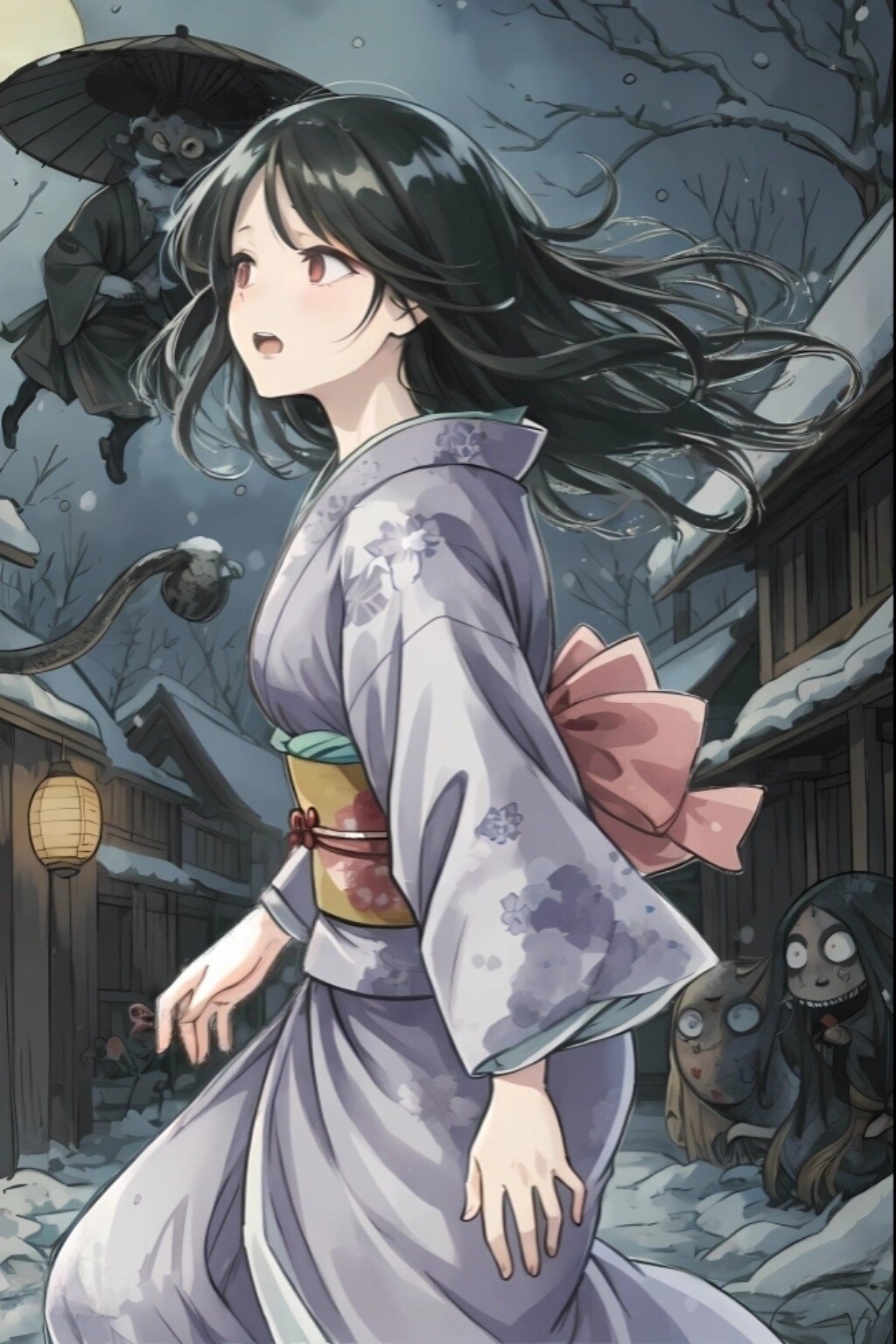 A frightened young Japanese woman in a lavender kimono, with long black hair, walking through a snowy traditional village at night. She is surrounded by various grotesque and whimsical yokai creatures lurking in the shadows and snow. Falling snowflakes. Watercolor illustration, traditional Japanese art style, horror manga aesthetic, ukiyo-e influence, soft lighting from a lantern, detailed, atmospheric, spooky yet beautiful.
