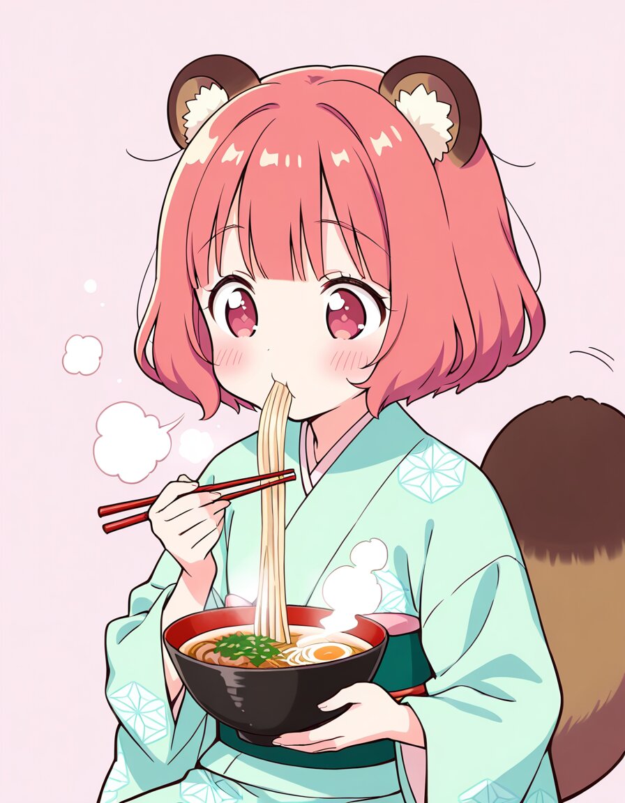 1girl, solo, kawaii, flat_chest, light_red_hair, short_hair, bob_cut, tanuki_ears, animal_ear_fluff, tanuki_tail, large_tail, fluffy_tail, tail_raised, mint_green_kimono, modern_kimono, pastel_colors, asanoha_pattern, subtle_pattern, deep_navy_obi, silver_trim_on_obi, obi, wide_sleeves, japanese_clothes, eating, ramen, noodle_bowl, bowl_in_hand, holding_chopsticks, chopsticks_in_both_hands, slurping_noodles, steam, hot_food, blush, face_flushed, red_cheeks, blowing, puffed_cheeks, warm_breath, sitting, upper_body, close-up, simple_background, detailed_face, expressive_eyes, highres, masterpiece, best_quality