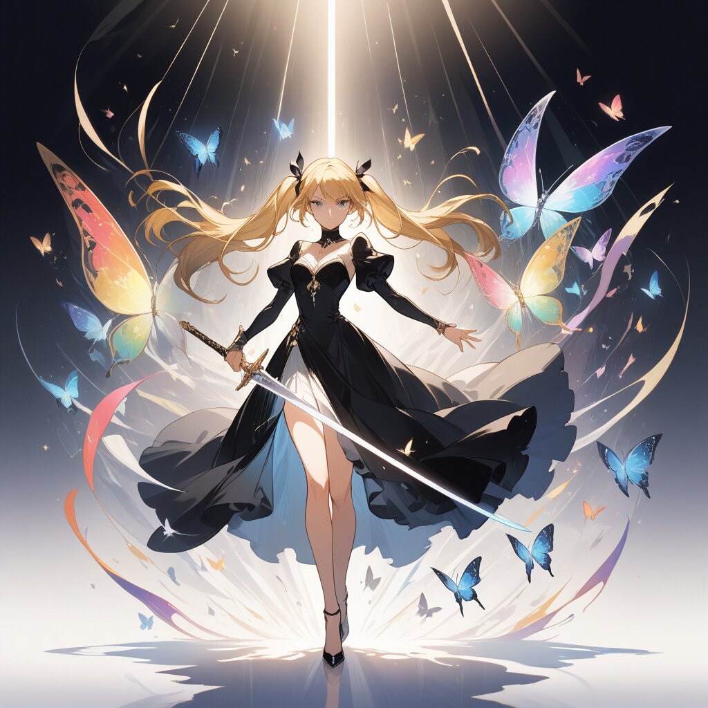 Best quality, Masterpieces, anime style,Set in a fantasy world, this illustration depicts a beautiful, sophisticated young woman engaged in close combat. She has blonde twin tails, fair skin, a calm and composed expression, and sharp eyes that convey a sense of fragility. Dressed in a classic black long dress and high heels, she exudes elegance. Standing with a confident posture, she holds a sparkling short sword with an anime-style design in both hands. Rainbow-colored butterflies surround her, casting soft shadows under studio lighting. Character design sheet. Featuring clean lines and high detail, growing music notes