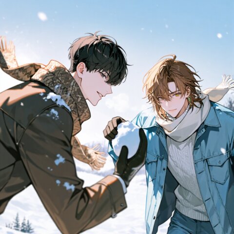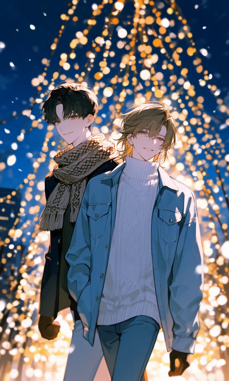 Vertical top-down shot against Christmas illumination. The scene is dominated by a late-night blue illumination background. midnight Two men walked side by side, One man: delicate Japanese man, short soft black hair, brown eyes, pale skin, gentle smile, Warm knit scarf and gloves, beautiful animation style, One is: the whole body, the portrait of a young man. The soft light shines on a man in his early 20s. His shoulder-length hair is light brown with golden highlights. He looked at the camera with a gentle expression, his lips slightly torn, and he smiled wistfully. She wears white knitwear, light blue denim jeans, and an oversized light blue denim jacket on her shoes, which evokes calmness and joy.