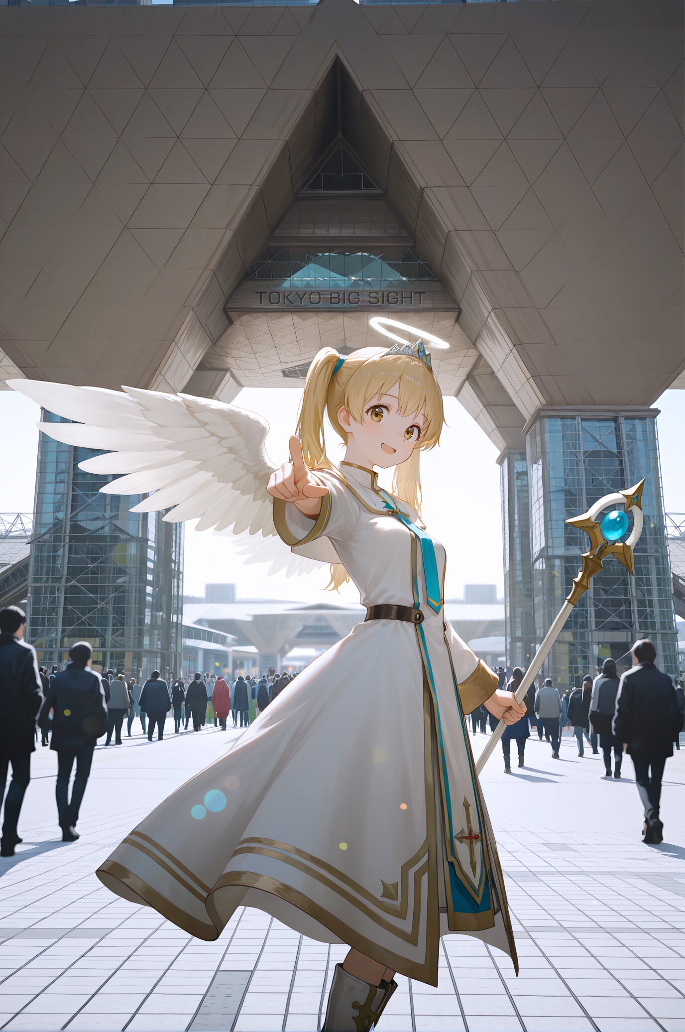 masterpiece, best quality, absurdres, 8k, ultra detailed, aesthetic, very aesthetic, newest, <lora:Fixhands_anime_bdsqlsz_V1:0.5>, <lora:bold-16oa:-0.5>, (realistic:0.3),BREAK (bokeh,shallow depth of field,Gaussian Blur:1.6),1girl, blonde hair, long hair, twintails,brown eyes, (white angel wings:1.2),tiara,(priestess outfit, staff, staff planted on ground, boots,standing,taff, holding staff, pointing staff at viewer,dynamic pose:1.2),(tareme,smile,one euyye closed:1.3),open mouth,(cowboy shot,wide angle,wide shot,from below,breasts focus,looking at viewer,side view,hand focus:1.3),white suitcase,<lora:USNR STYLE_XL_loha:0.8><lora:Tokyo-Bigsight-IllustriousXLV01-V2:0.6>(outside, public place, cosplay convention event, bigsight, kokusaitenjijou, pavement,crowd:1.2)