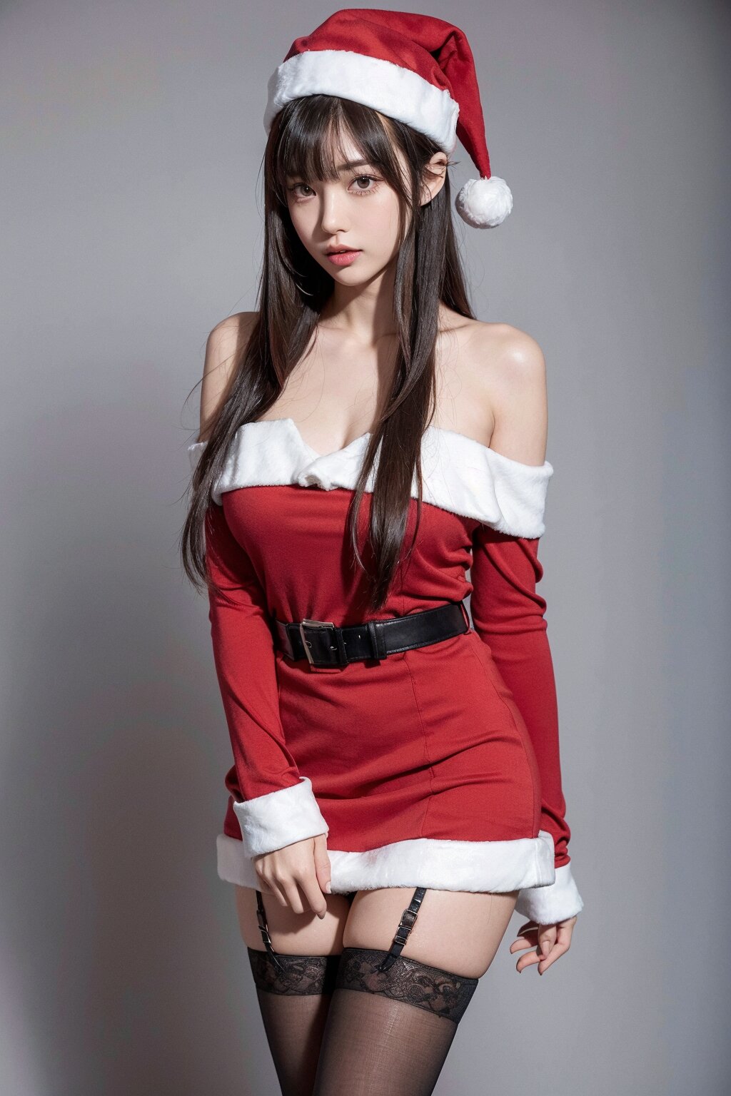 masterpiece, hyper detailed, 8K, hyper detailed illustration,extremely detailed CG, Japanese woman, 23yo, cute, pretty, hyper detailed face, hyper detailed eye, beautiful eye, extremely detailed, medium hair,(bangs:1.5), thin, tall,narrow waist, perfect anatomy, perfect proportions, extremely detailed body, santa hat,santa costume,santa dress, short skirt, red thighhighs, grey background,