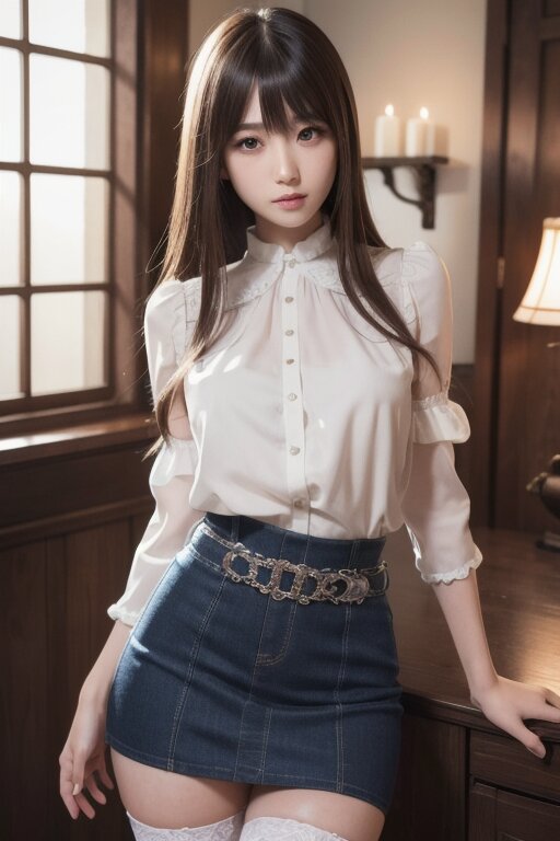 masterpiece, hyper detailed, 8K, hyper detailed illustration,extremely detailed CG, Japanese woman, 23yo, (cute:1.1), (pretty:1.1), hyper detailed face, hyper detailed eye, beautiful eye, extremely detailed, medium hair,(bangs:1.1), thin, tall, perfect anatomy, perfect proportions, extremely detailed body, blouse, short skirt, thighhighs, hyper detailed background,