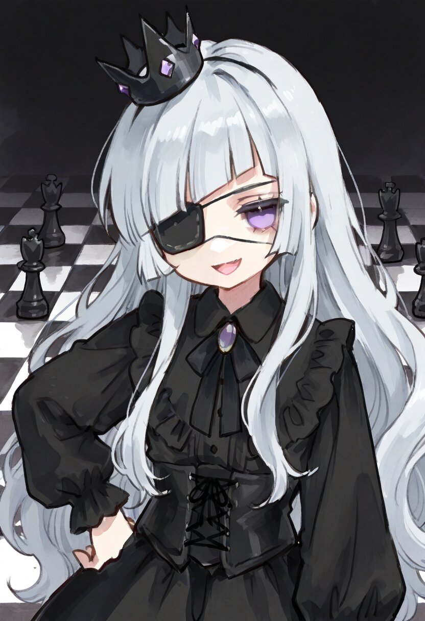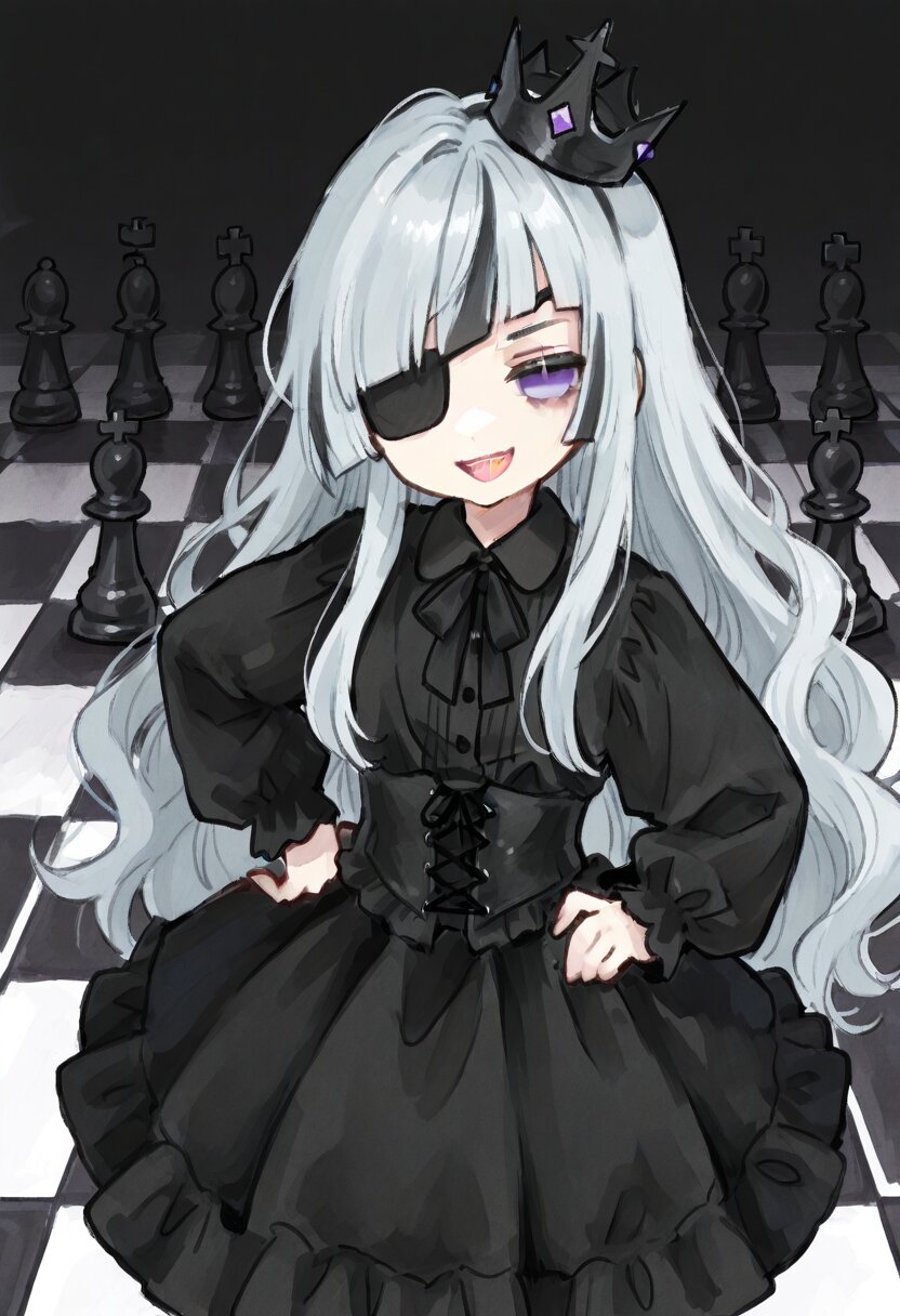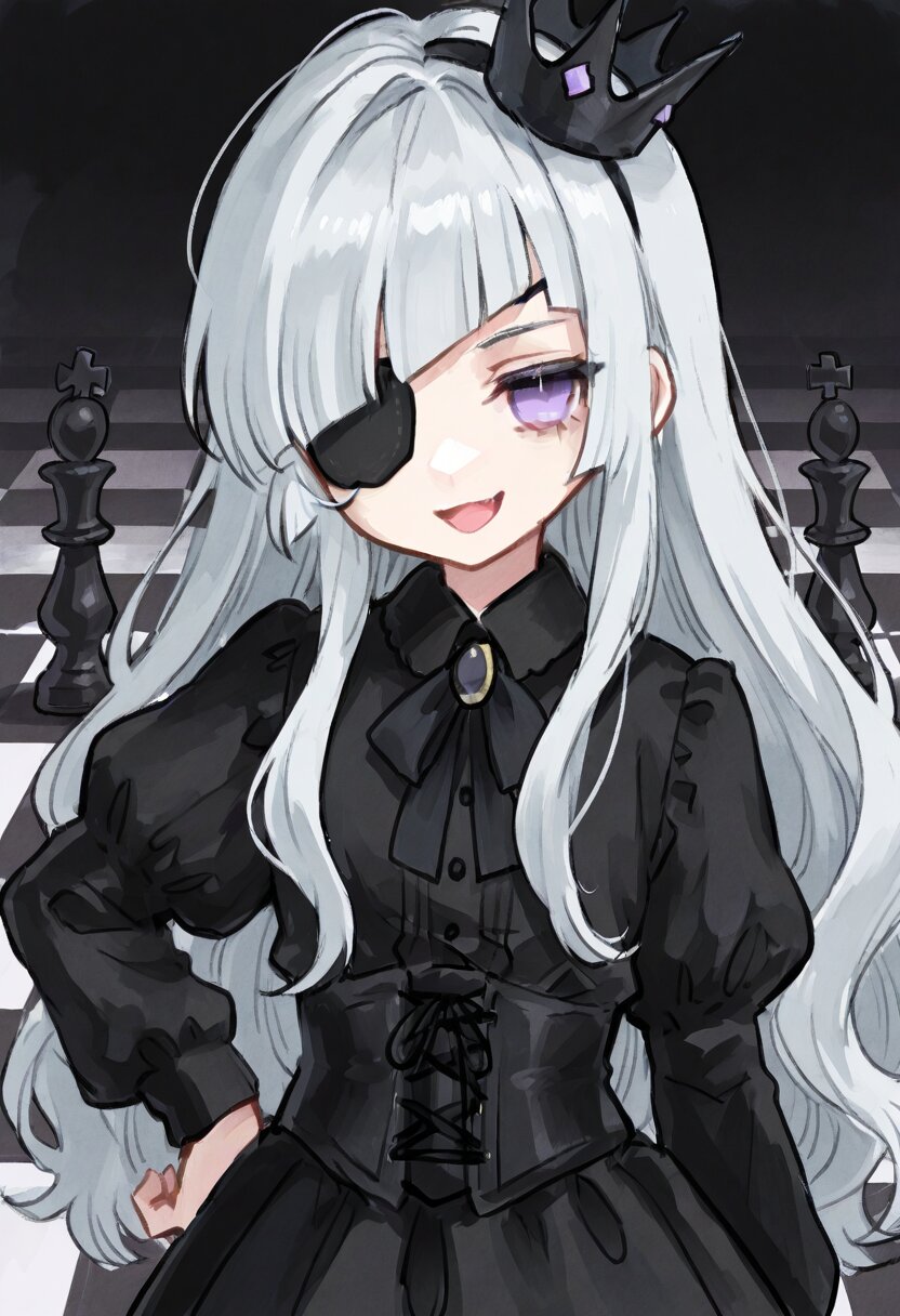 <lora:inmnstyleilxl:0.9>, ultra-detailed, best quality, masterpiece, very aesthetic, watercolor painting, general, 1girl, chibi, solo, upper body, gigantic black chess pieces, white and black checkered floor, black dress, long sleeves, puffy sleeves, sleeves decorated black ruffles, black lace-up corset, black chest ribbon with black jewel, black cloak, black crown, hand on own hip, silver hair, long hair, wavy hair, diagonal bangs, black highlights streaked hair, purple eye, black eyepatch, smirk, open mouth, looking at viewer