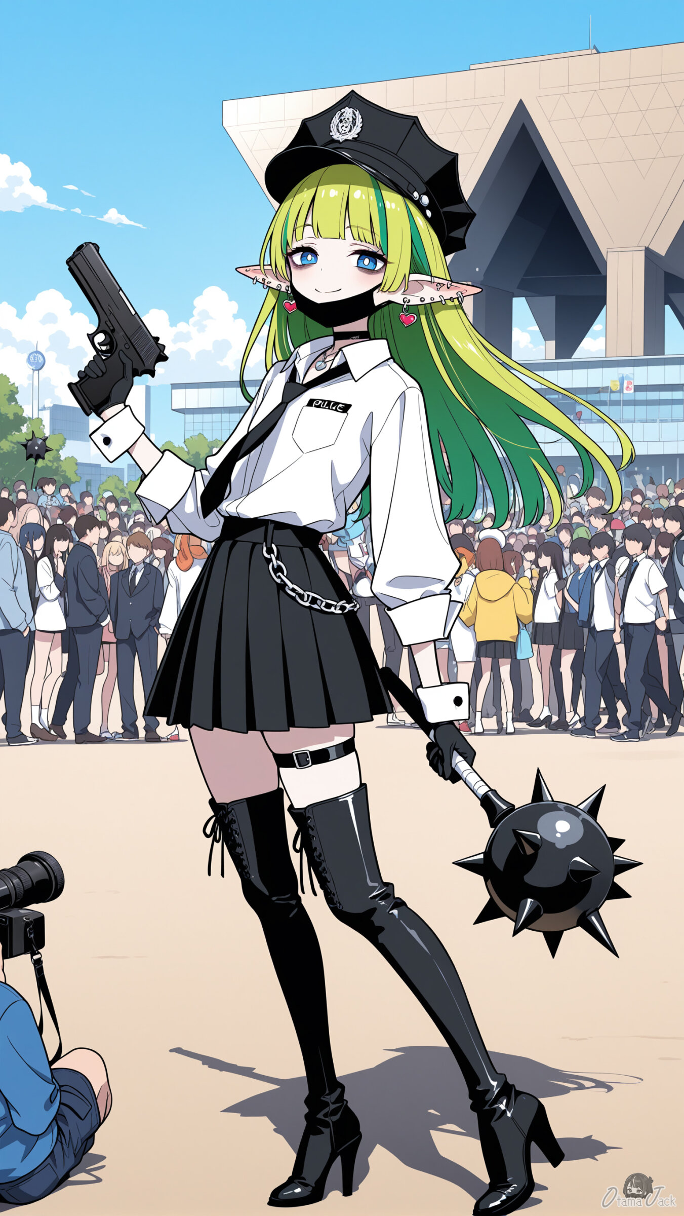 holding pistol,police cap,black headwear,uniform,shirt,white shirt,collared shirt,long sleeves,Roll up sleeves,necktie,black necktie,skirt,black skirt,pleated skirt,miniskirt,gloves,black gloves,boots,high heels,thigh boots,high heel boots,black footwear,thighhighs,thigh strap,choker,chain,thighs, BREAK Weapons, huge mace, spiked mace, mace-holding, morning star,