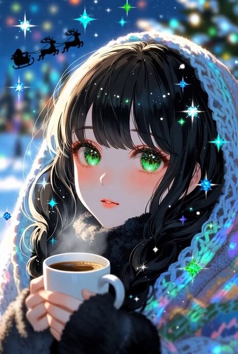 [Masterpiece, Highest Quality, Highest Quality, 8k] A cute and beautiful girl with black hair and green eyes is wrapped in a blanket in the beautiful icy air, holding a steaming cup of warm coffee and looking up at the sky, blue and green jewel-like stars twinkling in the winter sky, multiple exposure, anime style, Santa's sleigh flying in the sky, blurred background