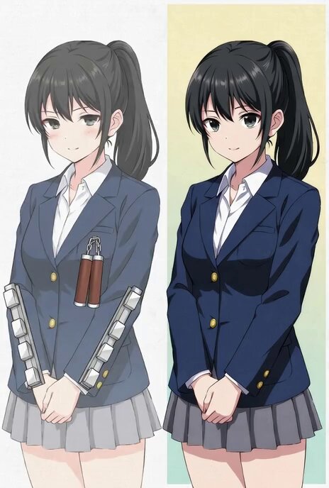 右側の女の子だけの画角にして、制服の内ポケットからヌンチャクを取り出し、ヌンチャクを使ったカンフーのアクション。