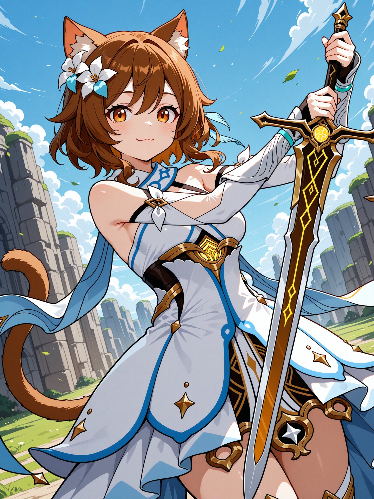 1girl, brown eyes, chestnut brown hair, wavy bob hair, hair between eyes, loose inward curls, cat ears, natural cat tail, :3, playful, dancing, dynamic pose, looking at viewer, lumine (genshin impact)(cosplay), hair ornament, white dress, flower, holding sword, blue sky, dutch angle, cowboy shot, (masterpiece, best quality, ultra-detailed, anime style, vector flat, flat color, depth of field)