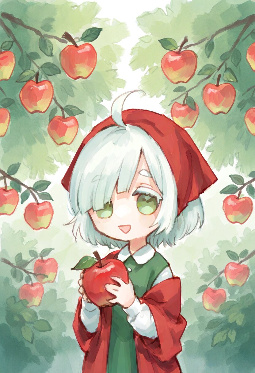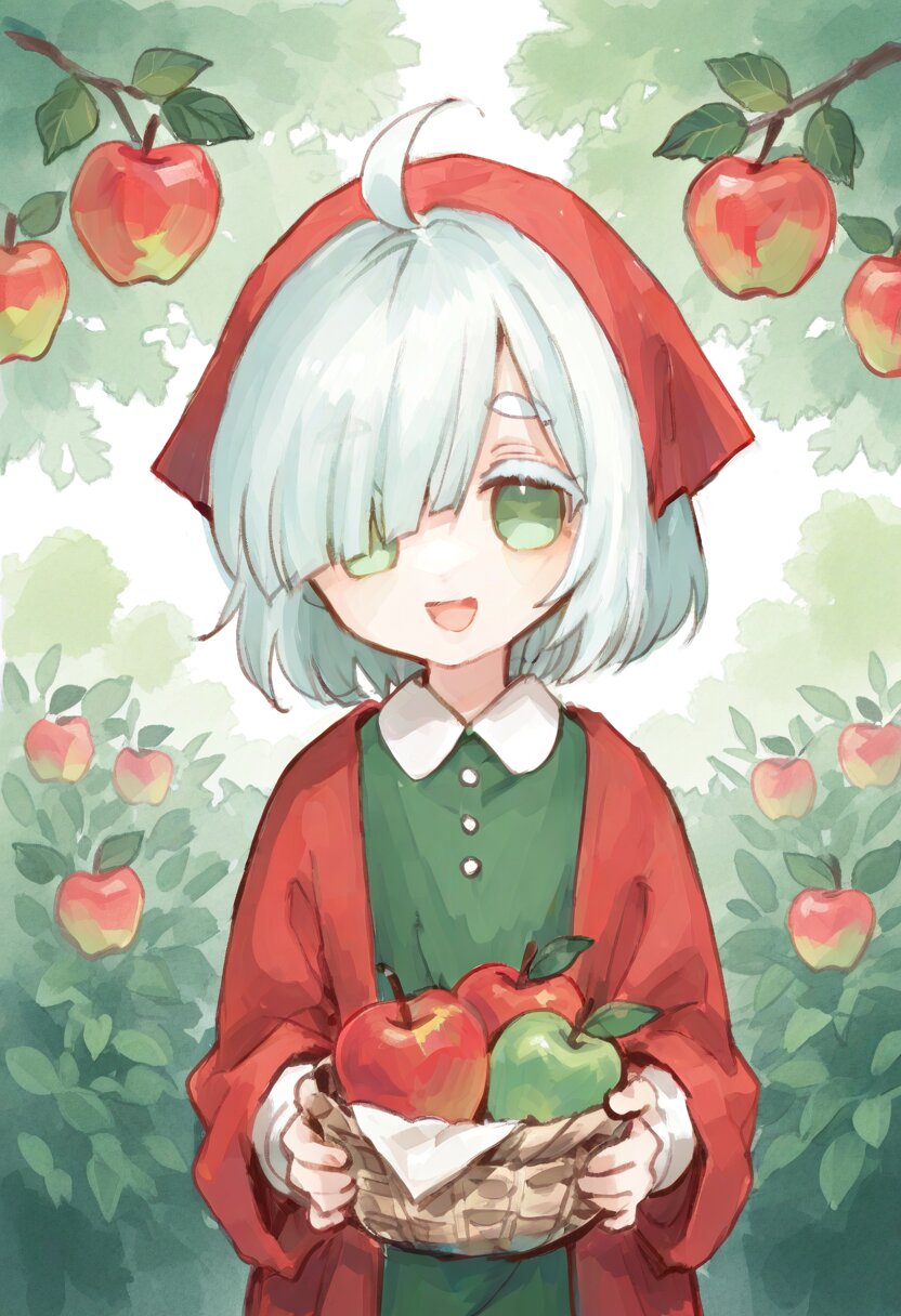 <lora:inmnstyleilxl:0.9>, ultra-detailed, best quality, masterpiece, very aesthetic, watercolor painting, general, 1girl, chibi, solo, apple orchard, holding basket of apple, red headscarf, red shawl, green dress, upper body, (bright white hair), short hair, blunt bangs, white thick eyebrow, white colored eyelashes, (hair over one eye), ahoge, mint green eyes, smile, open mouth, looking at viewer