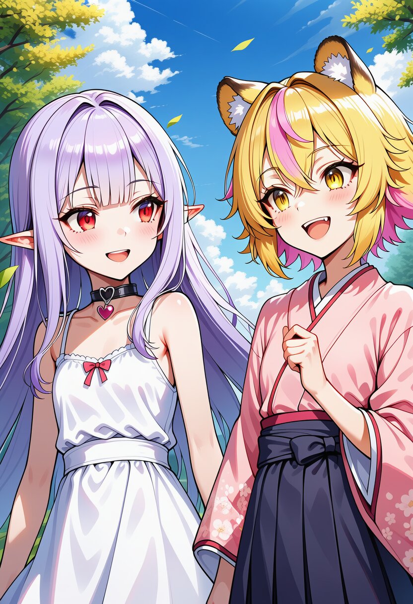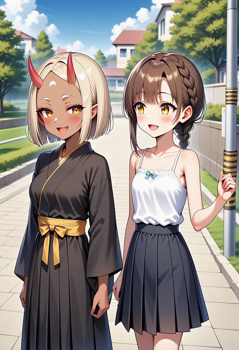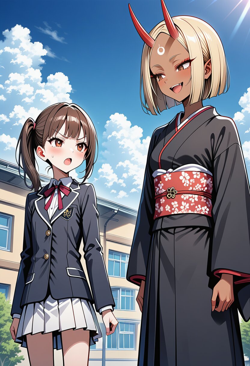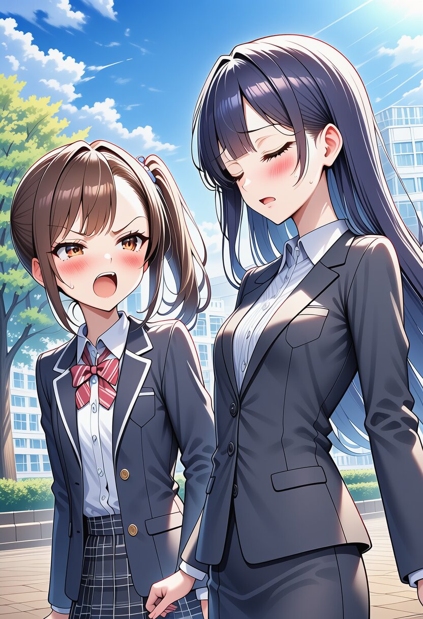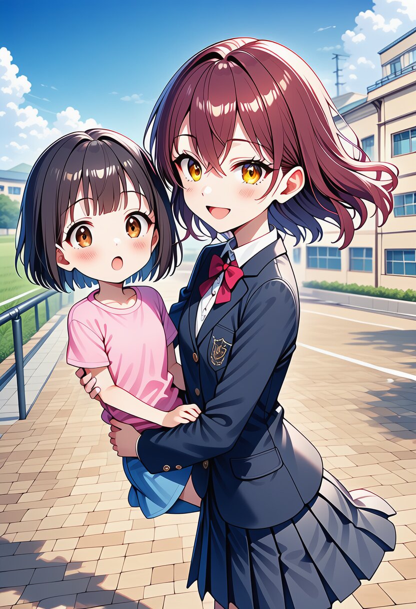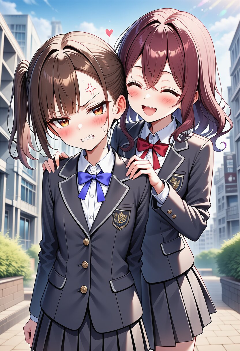 ai-generated, year 2024, anime style, 2girl, side by side, looking at each other, midday, outdoor, in school, from front angle, masterpiece, best quality, ultra detailed, perfect fingers, high resolution, absurdres, perfect anotomy, detailed background, unity 8k wallpaper, location, -2.5::hugging, looking at viewer::, very aesthetic, masterpiece, no text