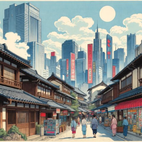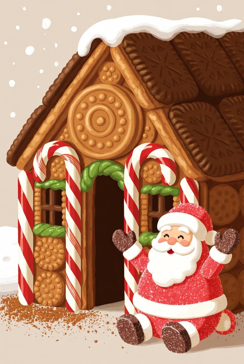 A festive Christmas scene with a cookie house and sugar candy Santa Claus, in a warm digital illustration style.