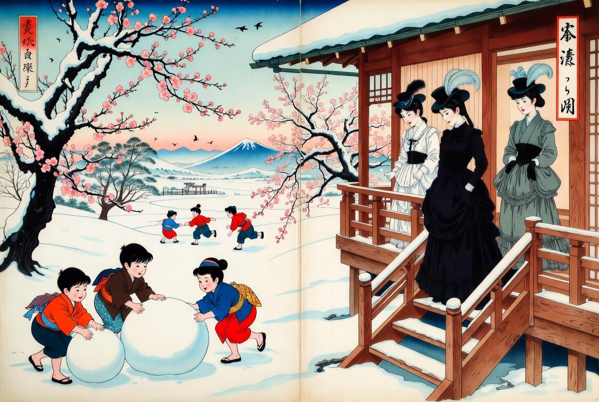 A modern realistic illustration inspired by Utagawa Kuniyoshi's Meiji era triptych ukiyo-e prints. Right side: elegant women in Western attire wearing Victorian-style dresses, elaborate hats, and bustle gowns, standing on the balcony and stairs of a Western-style wooden building, admiring blooming plum blossoms in the snow. Center and left side: colorful Japanese-dressed children joyfully playing in the snow, rolling and throwing large snowballs, with pink plum blossoms on branches set against a snowy landscape, distant mountains, and birds flying in the sky. Featuring vibrant colors, detailed depictions, thick outline strokes, flat perspective, and traditional ukiyo-e composition.