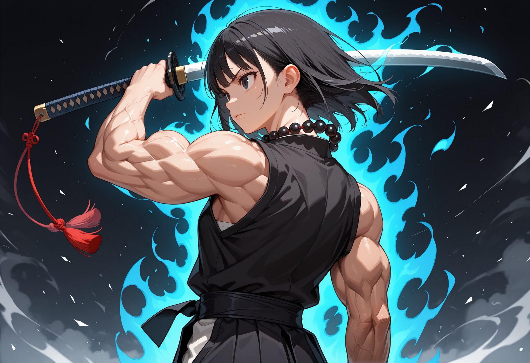 masterpiece,best quality,amazing quality,high resolution,ultra-detailed,very aesthetic,8k,highly detailed,beautiful detailed eyes,general,(portrait,from behind),1girl,solo,17yo,cute,(extreme muscular female,toned female,slender but muscular body,extremely defined muscular,(defined muscular arms,toned arms:1.3),aura,spread one arm,arm at side,holding a huge katana:1.3),(black Buddhist prayer beads necklace,black hair,short hair,bangs,light smile,medium hair),cute girl,slender,small breasts,black eyes,closed mouth,angry,sleeveless,monk girl,(black clothes,black kimono,black inner shirt under karate gi,black sash,very long black hakama),slender girl,young,wind,fantasy,