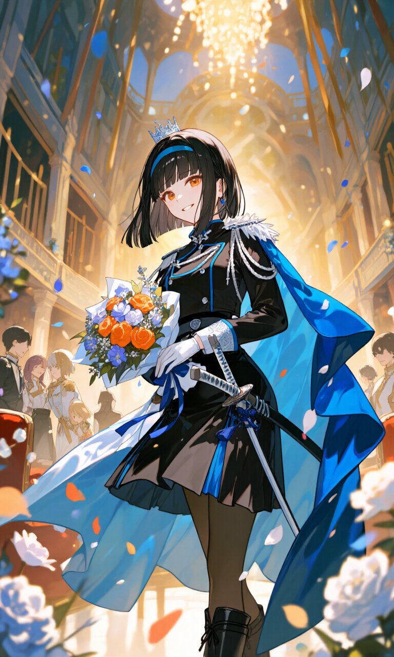 A 15-year-old girl with beautiful, straight black hair styled bluntly at the ends, adorned with a (blue hairband), stands gracefully in a luxurious ballroom. Her striking (orange eyes) are bright and expressive, radiating warmth and happiness. She wears a regal (Black luxurious Prince costume with Blue trim:1.5), featuring long sleeves, an (aiguillette), and a (luxurious White gloves:1.2). The outfit includes a (luxurious Black mini skirt:1.3) and tall (Black luxurious boots:1.3), while a (Blue luxurious Cape:1.3) flows elegantly behind her. A delicate (crown:1.3) rests atop her head, and a (Katana on waist:1.3) adds a noble touch. She holds a vibrant (holding a bouquet in hand:1.5), surrounded by a dreamy, romantic atmosphere filled with soft lighting and blooming flowers. The ballroom is grand, with (Futurism architecture) and intricate details, evoking a (romantic academia) aesthetic. She is (surrounded by friends:1.8), all sharing in the joyful celebration. The scene is bathed in warm, ethereal glow, with delicate petals floating in the air, enhancing the (dreamy atmosphere). Masterfully detailed skin, clothing, and environment create a breathtaking, high-quality composition.