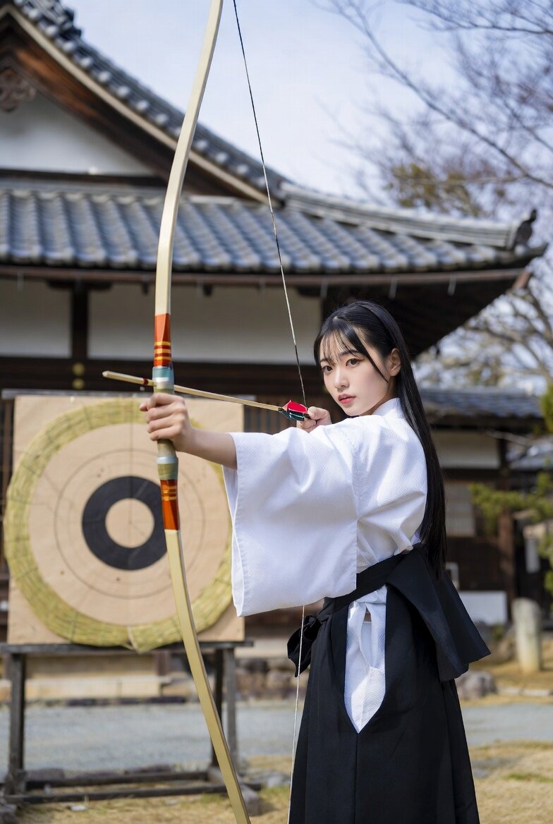 A photorealistic image of a young Japanese woman in kyudo attire aiming a bow at a target in a traditional Japanese setting.