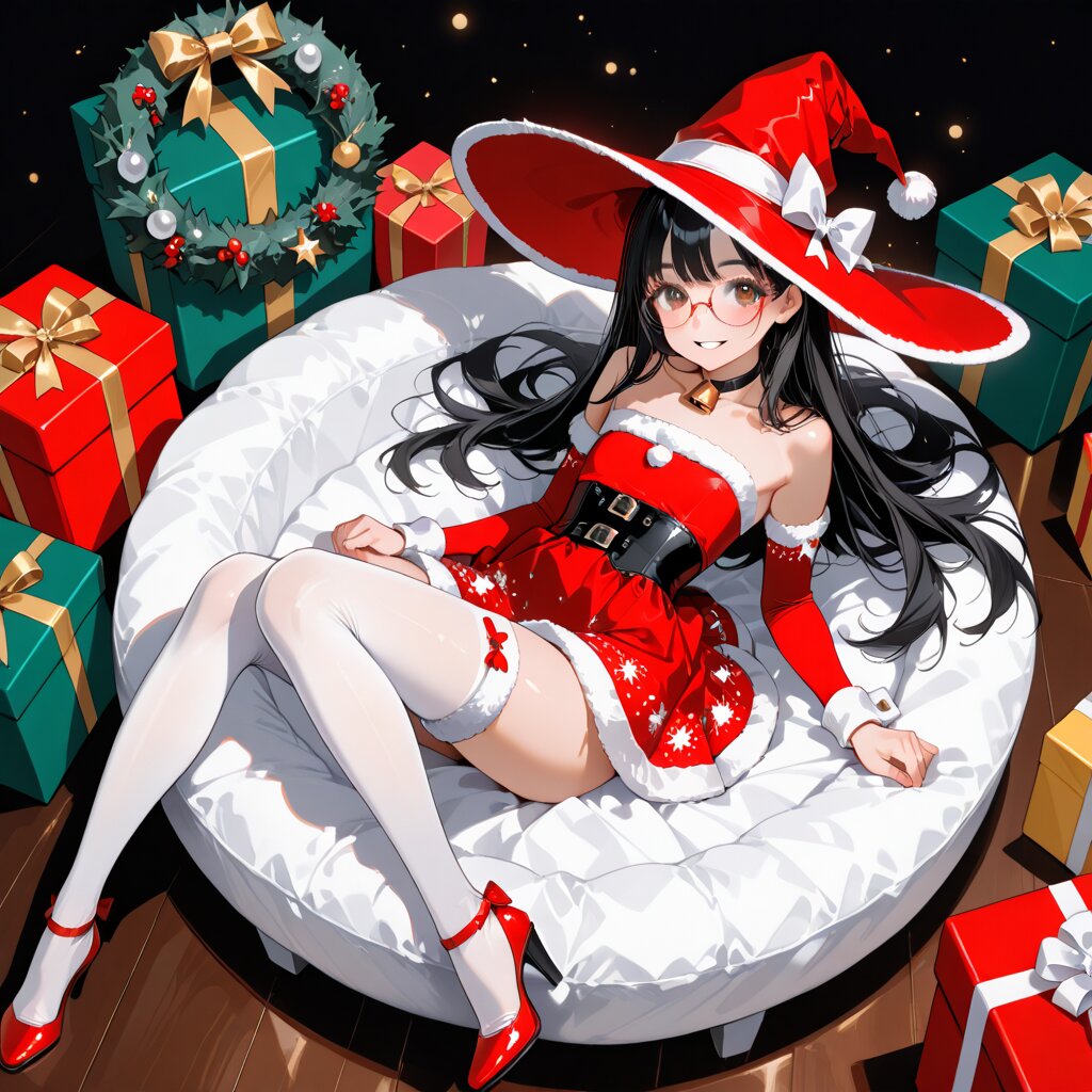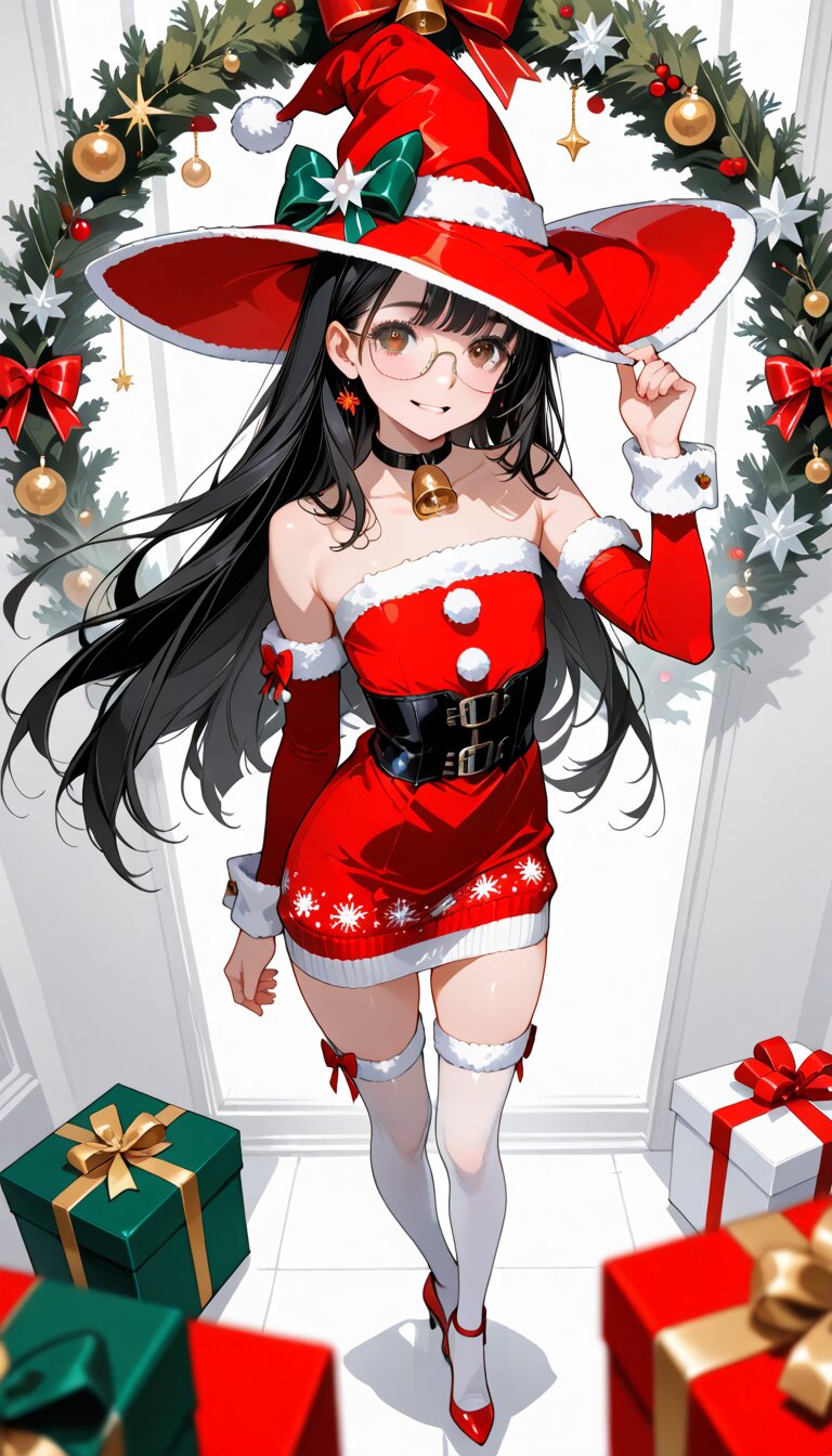 (rating: sensitive:1.2), score_9, score_8_up, score_7_up, score_6_up, NSFW, (delicate illustration), (perspective, super dynamic angle from above), diagonal view. in flat color style illustration, sharp sketch. 1girl with glasses:1.3, tareme, wearing a witch hat and Xmas short dress, cable knitted sweater dress, fur-trimmed dress, white fur, white fur trim, red dress, black underbust, neck bell, bow, choker, red arm warmers, white wrist cuffs, fur-trimmed arm warmers, strapless dress, bare shoulders, white thighhighs, fur-trimmed thighhighs, bow, high-heels, slim legs, (straight black hair, very long hair), floating hair, and a black kitty. (fashion illustration, flat colors, ultra-intricate detailed), flat design, bold colors, patterned fabric, beautiful composition. BREAK insanely beautiful and detailed clothes, intricately hair, beautiful small face, long eyelashes, double eyelids, parted lips, smile, kawaii, cute, (flat chest, slender), exquisitely delicate skin, perfect anatomy, perfect legs, dynamic angle, dynamic pose, BREAK ((DOF), blurry foreground), sharp focus on the girl, increasing depth, perfect AI rendering, three-quarter view, tiny Christmas wreath background, lots of gift boxes, realistic background, BREAK (masterpiece, aesthetic quality, 8K, ultra-detailed), Xmas color palette, (perfect design, realistic complex), absurdres, highres, hyperrealistic, photorealistic, Xmas lighting,