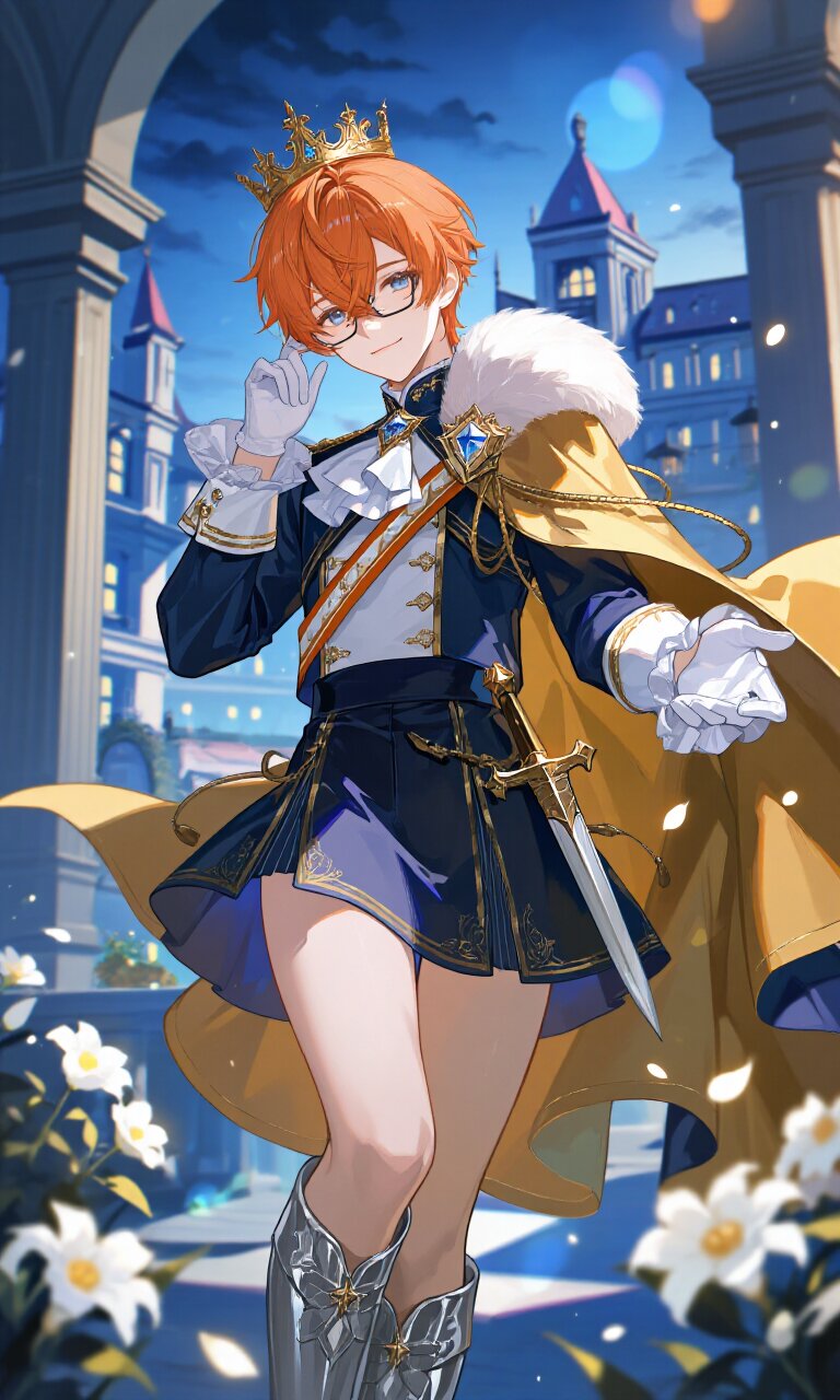 1boy, a 17-year-old prince with striking orange hair styled in long crossed bangs and piercing blue eyes, featuring one delicate mole under his left eye. He wears boston-style glasses that complement his beautiful face, with soft, beautiful lips and a gentle smile. His (luxurious Navy Prince costume:1.6) includes long sleeves, a (luxurious Navy mini skirt:1.4) revealing bare thighs, and (luxurious Silver Boots:1.3). A (dagger on waist:1.3) adds a touch of danger, while a (luxurious crown on head:1.4) and (White luxurious gloves:1.2) complete his regal attire. The (luxurious Gold Cape:1.3) flows elegantly behind him as he stands in a pose that is both cute and princely. The background is a grand palace with Art Deco architecture, surrounded by romantic academia elements, outside in the dusk during the blue hour. Soft lighting and lens flares enhance the scene, with flowers adding a touch of nature. The atmosphere is one of gloom and beauty, with intricate details in his face, skin, hair, and clothes, making this a masterpiece of insanely detailed, 16k quality. The style is romantic and fantastical, with an absurdly high resolution that captures every minute detail.