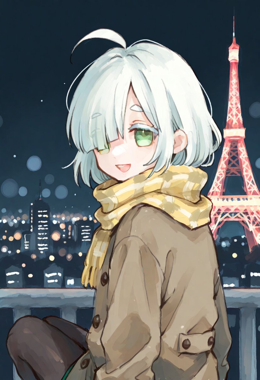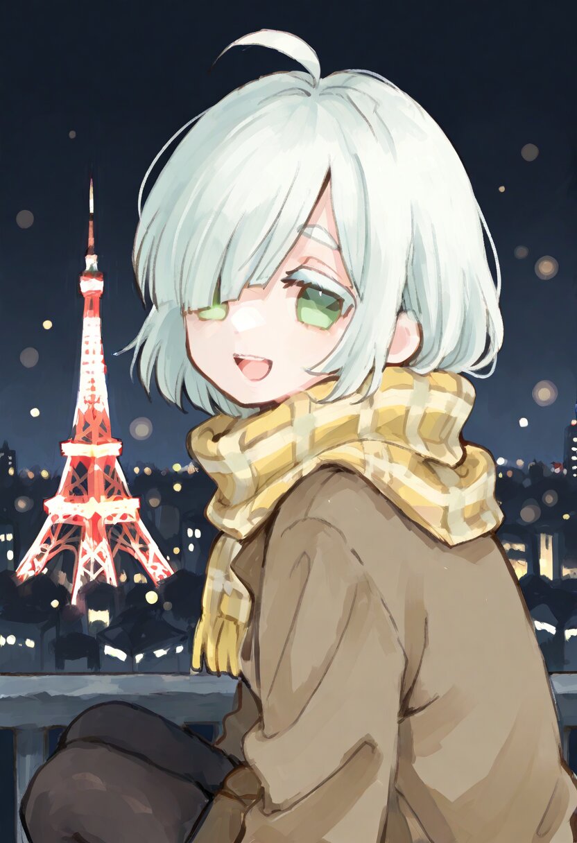 <lora:inmnstyleilxl:0.9>, ultra-detailed, best quality, masterpiece, very aesthetic, watercolor painting, general, 1girl, chibi, solo, tokyo tower, night city, bokeh, night sky, look back, upper body, (bright white hair), short hair, blunt bangs, white thick eyebrow, white colored eyelashes, (hair over one eye), ahoge, mint green eyes, oversize brown coat, yellow plaid scarf, black tights, smile, open mouth