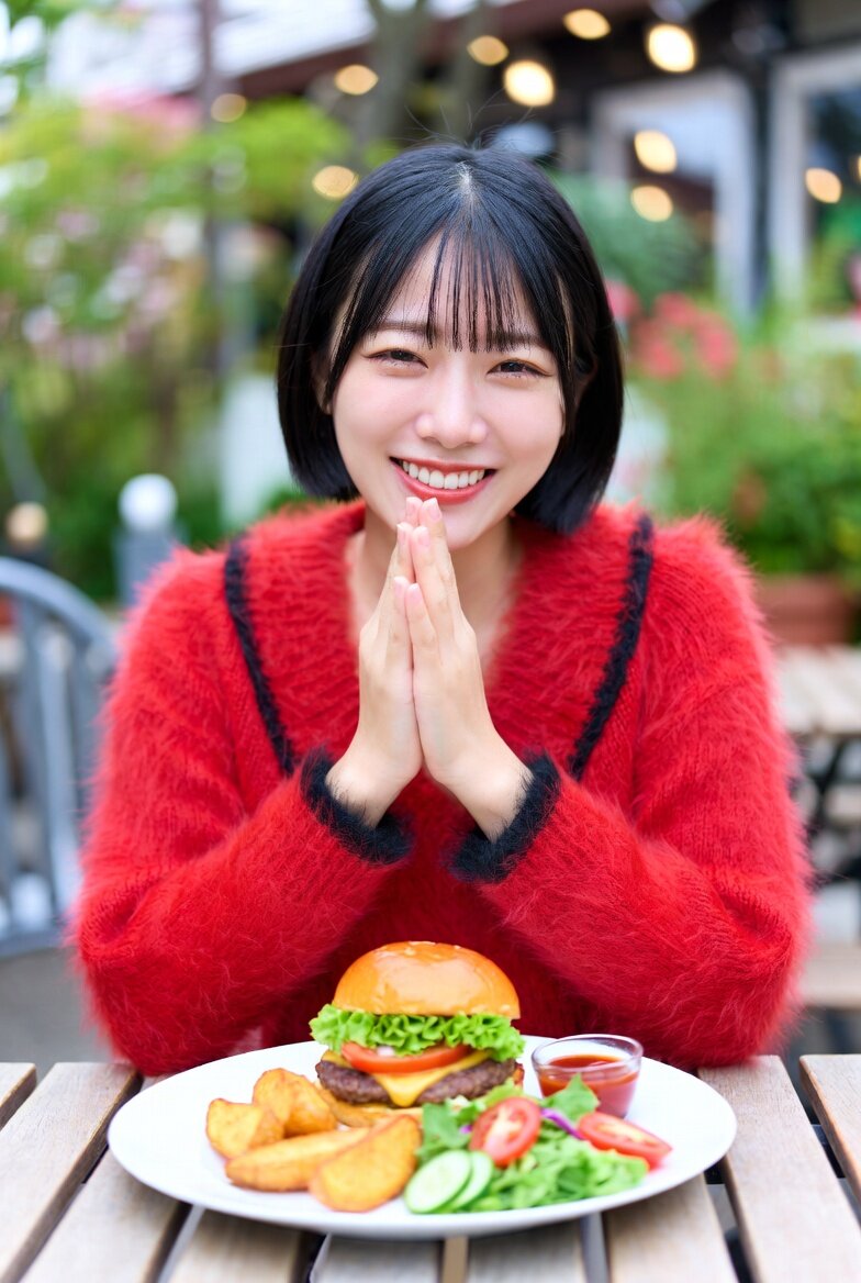 A 20s Japanese woman with short black bob hair and straight bangs, smiling happily with her eyes slightly closed, sitting at an outdoor wooden table in a garden cafe. She is wearing a bright red fluffy knit sweater with black trim. Her hands are clasped together near her face in a cute, excited gesture. In front of her on the table is a white plate with a gourmet burger topped with lettuce and tomato, accompanied by wedge-cut fried potatoes, fresh salad with sliced cucumbers, tomatoes, and greens, and a small glass cup of ketchup. Natural daylight, soft bokeh background with greenery and blurred plants, warm and inviting atmosphere, high detail, photorealistic, professional food and portrait photography style.