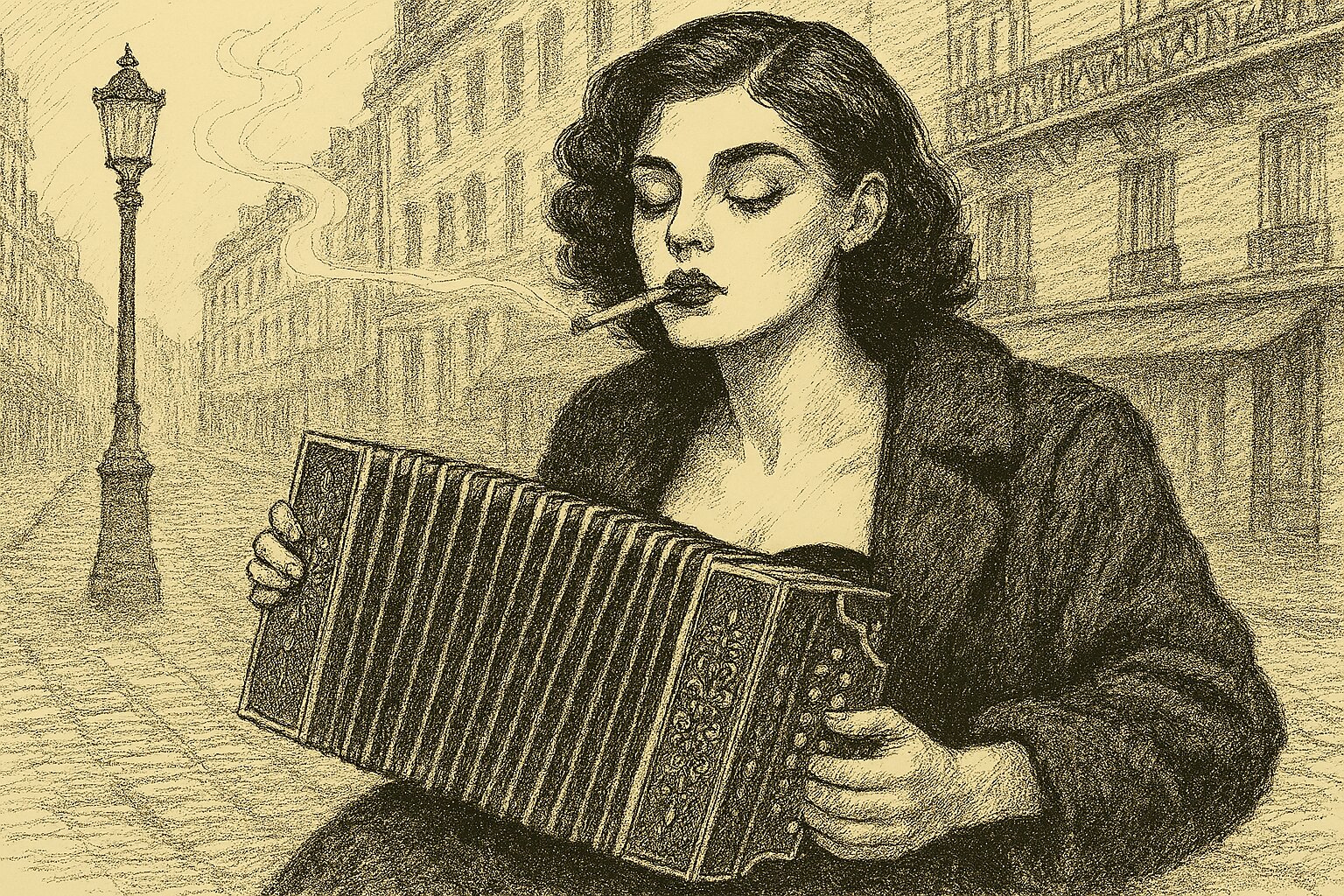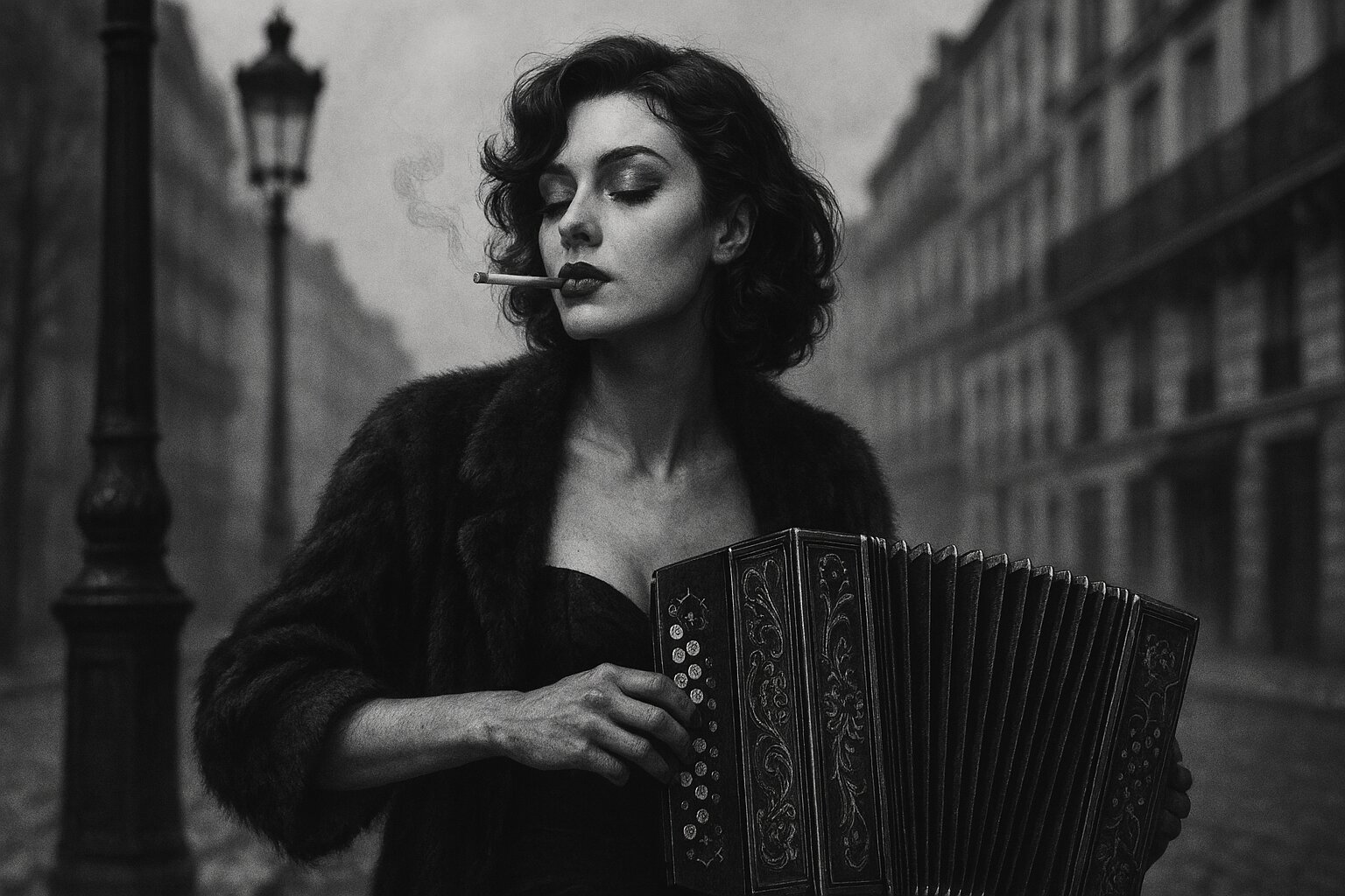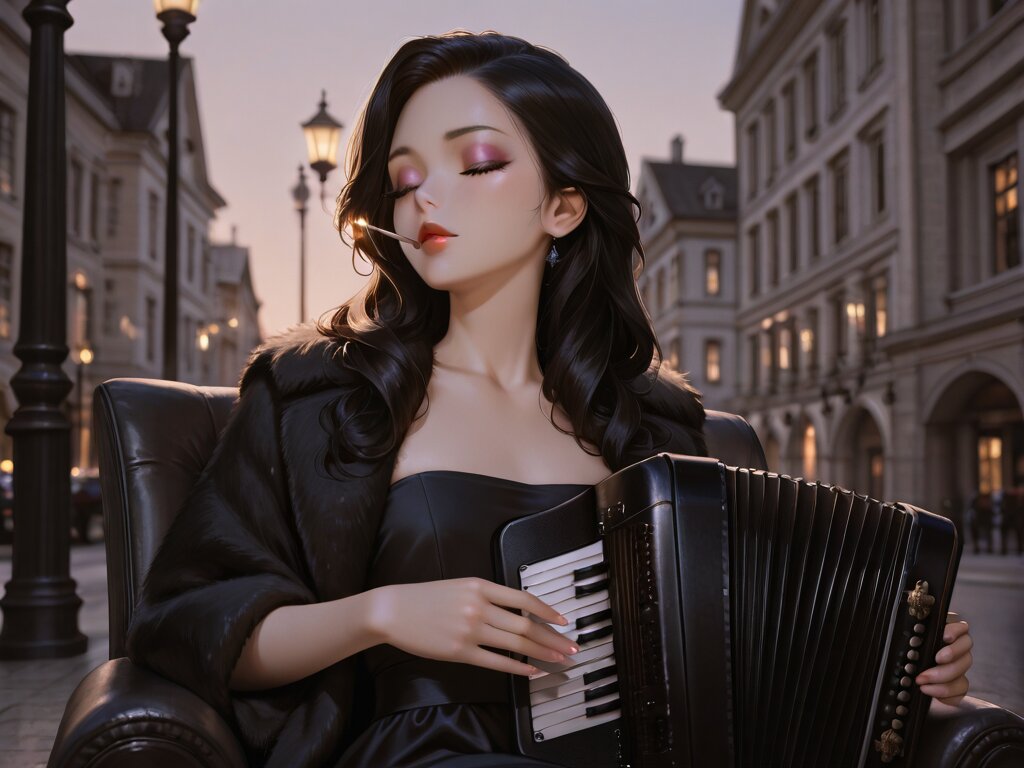 Masterpiece, Best Quality, Amazing Quality, Very Aesthetic, High Resolution, Ultra-Detailed, Absurdres, Newest, Scenery, 3D, Rendered, General, 1Girl, Accordion, Smoking, Cigarette, Melancholic, Old _Hollywood, Flat_Chest, Medium_Hair, Curled_Hair, Wavy_Hair, Red_Lipstick, Glossy_Lips, Eyeshadow, Long_eyelashes, Mascara, Fur_Coat, Evening_Gown, Black_Dress, Strapless_Dress, Fronted, Sitting, Playing_Instrument, Vintage, European_Street, Haussmann_Architecture, Lamppost, Soft_Lighting, Warm_Color_Palette, Seductive, Elegant, High_Cheekbones, Closed_Eyes, Solo, Cinematic_Lighting, BREAK, Depth_of_Field, Volumetric_Lighting,