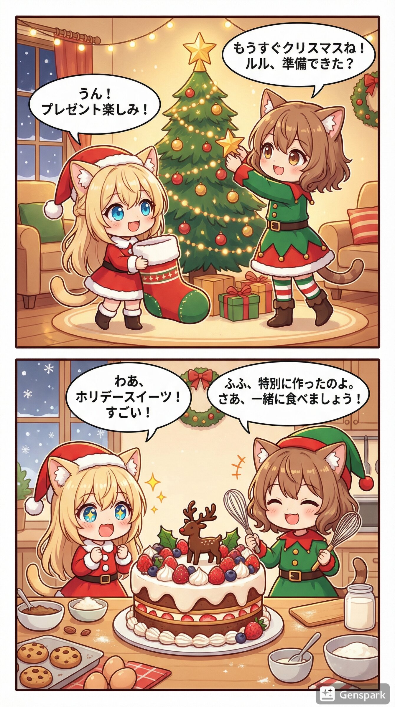 「12月24日・ホリデースイーツ」をテーマに、添付画像のキャラたちが登場するユニークな短編漫画を作って。茶髪はおねえちゃん。金髪はルル。セリフはすべて日本語。右から左へ読むことを前提としたセリフ配置。キャラの服はネタに合うものに着替えさせて。