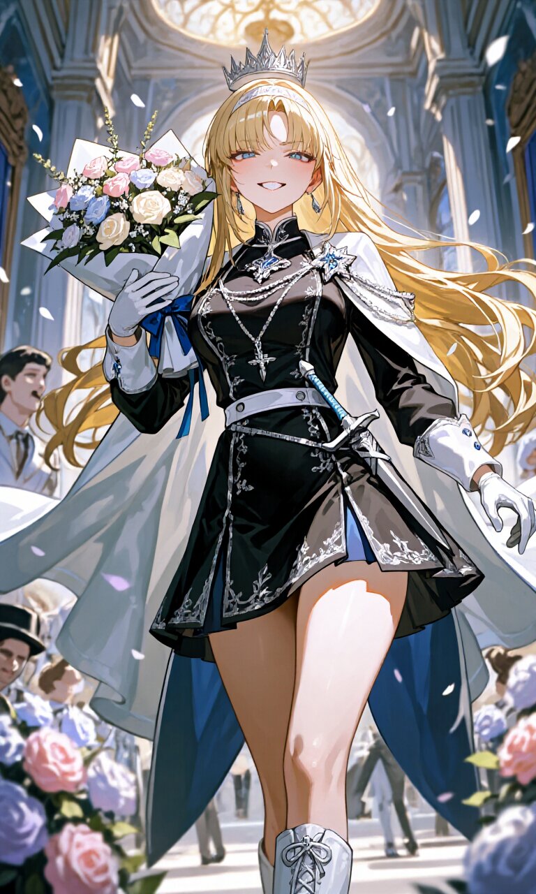 1girl, a stunning 20-year-old woman with long, flowing blonde hair adorned with a delicate white hairband stands confidently in a luxurious palace ballroom. Her narrowed blue eyes sparkle with ambition, framed by a (detailed face) featuring flawless skin and a (cute face) that contrasts with her mischievous grin and greedy expression. She wears an exquisite (Black luxurious Prince costume with silver embroidery:1.5) with long sleeves, paired with a (White luxurious Cape:1.3) that billows dramatically. Her (luxurious Black mini skirt with silver embroidery:1.3) flows elegantly over her legs, complemented by (White luxurious boots:1.3). A (dagger on waist:1.3) glints at her hip, while a (luxurious crown:1.3) rests atop her head. She wears (luxurious White gloves:1.2) and a gleaming (rosary:1.4) around her neck. In one hand, she holds a lavish (bouquet:1.5) of flowers, her fingers delicately gripping the stems. The scene takes place in a grand ballroom with Baroque architecture, filled with (lots of flowers) and bathed in soft, dreamy lighting. A mystical and romantic academia atmosphere envelops the space as she is (surrounded by friends:1.8), all dressed in elegant attire. The air is alive with celebration, evoking a light, enchanting, and slightly whimsical mood. The intricate details of her costume, the palace decor, and the expressions of those around her create a masterpiece of insanely detailed, 16K-quality beauty.