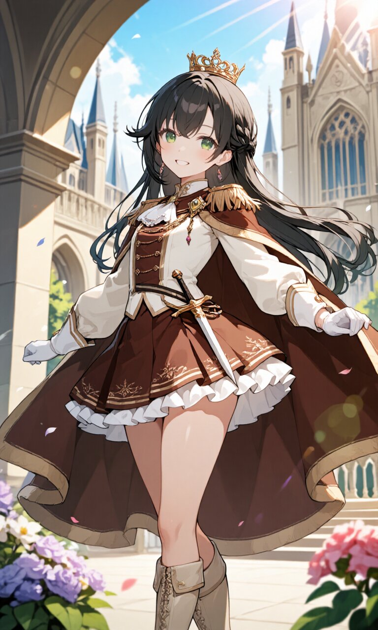 A 25-year-old young woman with a delicate, beautiful face and striking green eyes stands confidently in a grand palace courtyard surrounded by Gothic architecture. She has (long black hair:1.3) styled in an intricate (half up braid:1.3) with a (french braid:1.3) cascading down her back, complemented by (flipped long bangs:1.3) framing her face. Her slender figure features a (flat chest:1.5) and (large hips), accentuated by her (White luxurious Prince costume:1.6)—a regal ensemble with long sleeves, a fitted bodice, and a (luxurious mahogany mini skirt:1.4) layered over a white ruffled underskirt. A (luxurious chestnut cape:1.3) drapes elegantly over her shoulders, fastened with an ornate brooch. She wears (Ivory luxurious boots:1.3), (White luxurious gloves:1.2), and a (luxurious crown on head:1.4), exuding princely charm. A finely crafted (dagger on waist:1.3) rests at her hip. Sunlight filters through the palace arches, casting soft beams and lens flares across the scene as she smiles warmly, surrounded by blooming flowers in the romantic afternoon glow. The atmosphere is dreamy and regal, with meticulous attention to textures—from embroidered fabrics to polished leather—rendered in insanely detailed 16K quality. The soft lighting enhances the romantic academia aesthetic, blending elegance with fantasy.