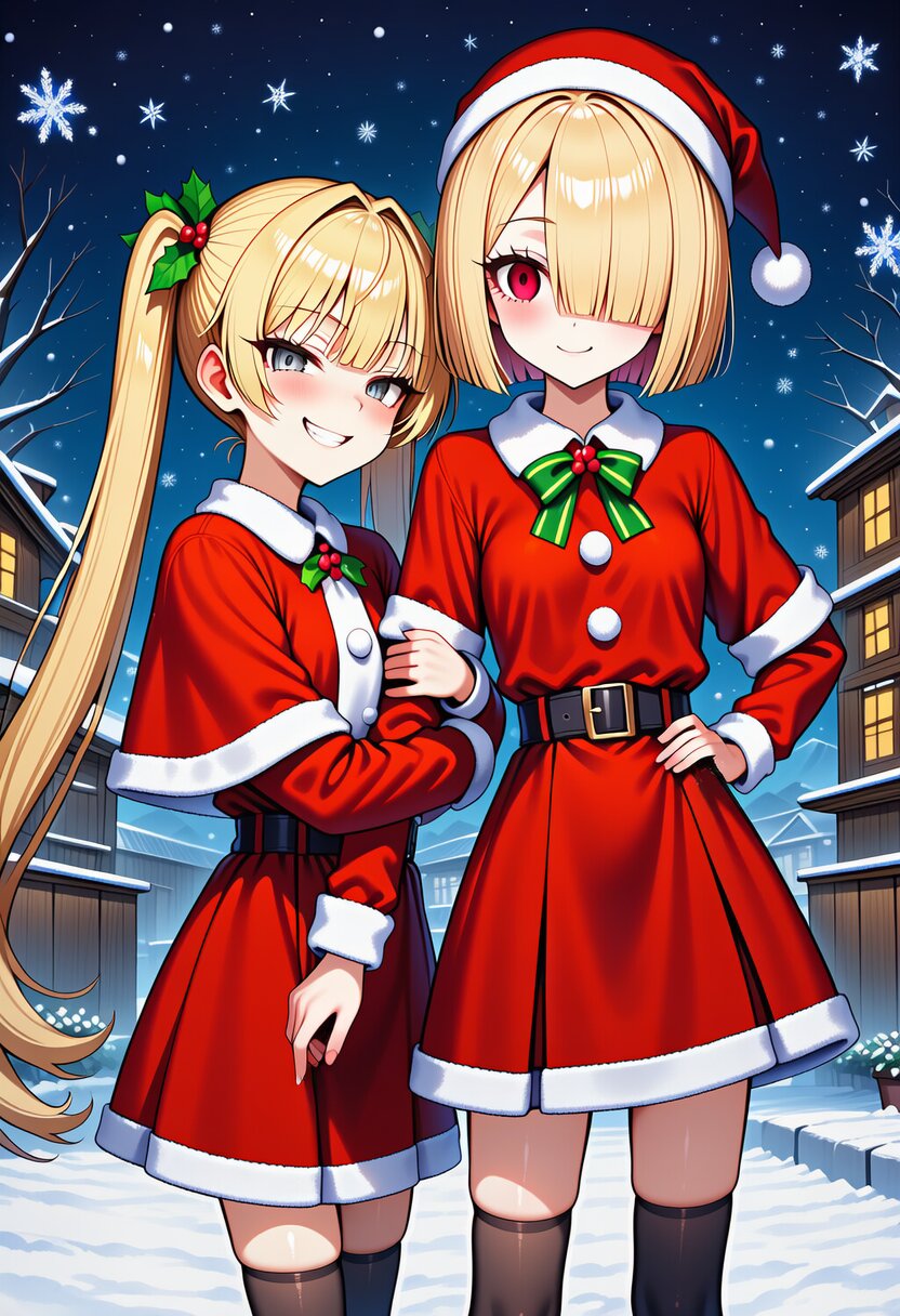ai-generated, year 2024, anime style, 2girl, yuri, midnight, earmuffs, snowscape, christmas ornaments, star (symbol), outdoor, snowy, in ancient residential area of the oriented countryside, from front, masterpiece, best quality, ultra detailed, perfect fingers, high resolution, absurdres, perfect anotomy, detailed background, unity 8k wallpaper, very aesthetic, masterpiece, no text