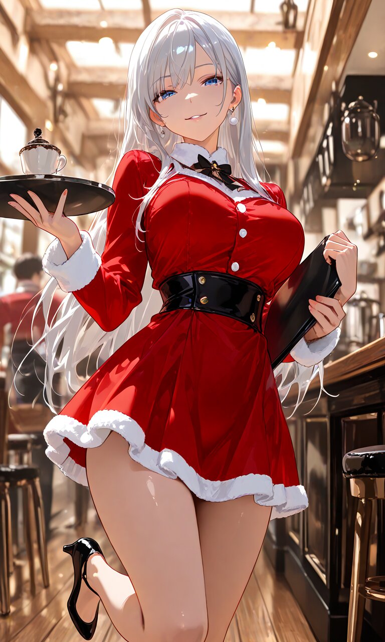 (best quality),(masterpiece),(ultra detailed),1 lady, long hair, silver hair, blue eyes, sedcutive smile, big breasts, ((santa costume, cafe, waiter)), cowboy shot