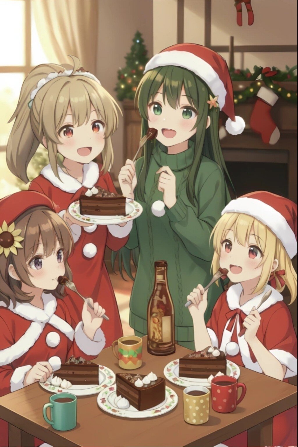 anime style, four young girls, festive Christmas party, enjoying chocolate cake, happy expressions, wearing Santa hats, cozy indoor setting, fireplace with Christmas decorations in the background, warm lighting, long hair, big eyes, detailed clothing, high quality, soft shadows, cheerful atmosphere