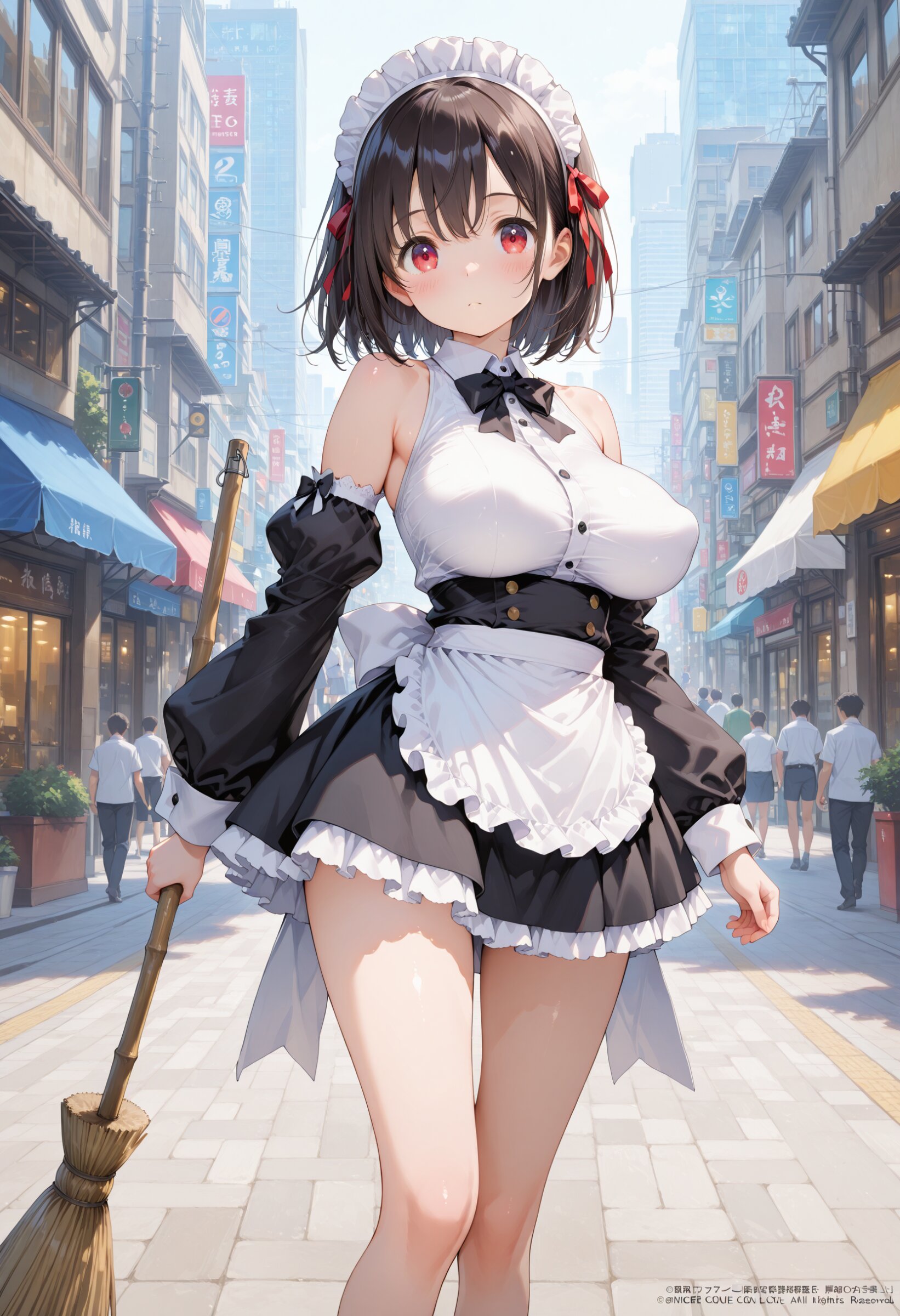 masterpiece, best quality, amazing quality, general, fine detail, official art, 1girl, loli, petite, beautiful hair, beautiful eyes, white maid uniform, detached black sleeves, bare shoulders, white waist apron, miniskirt, beautiful legs, big breasts, impossible clothes, (perky breasts:1.2), innocent expression, , Urban city square, Holding a broom and taking a defensive stance,
